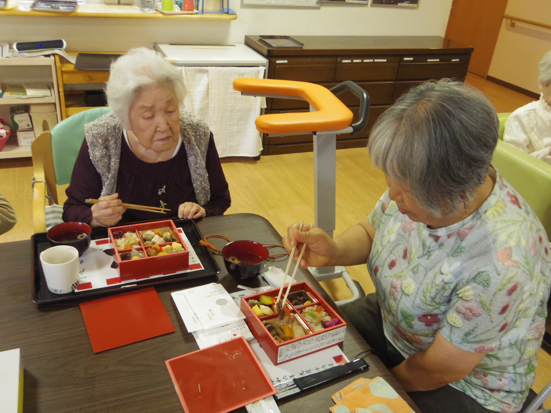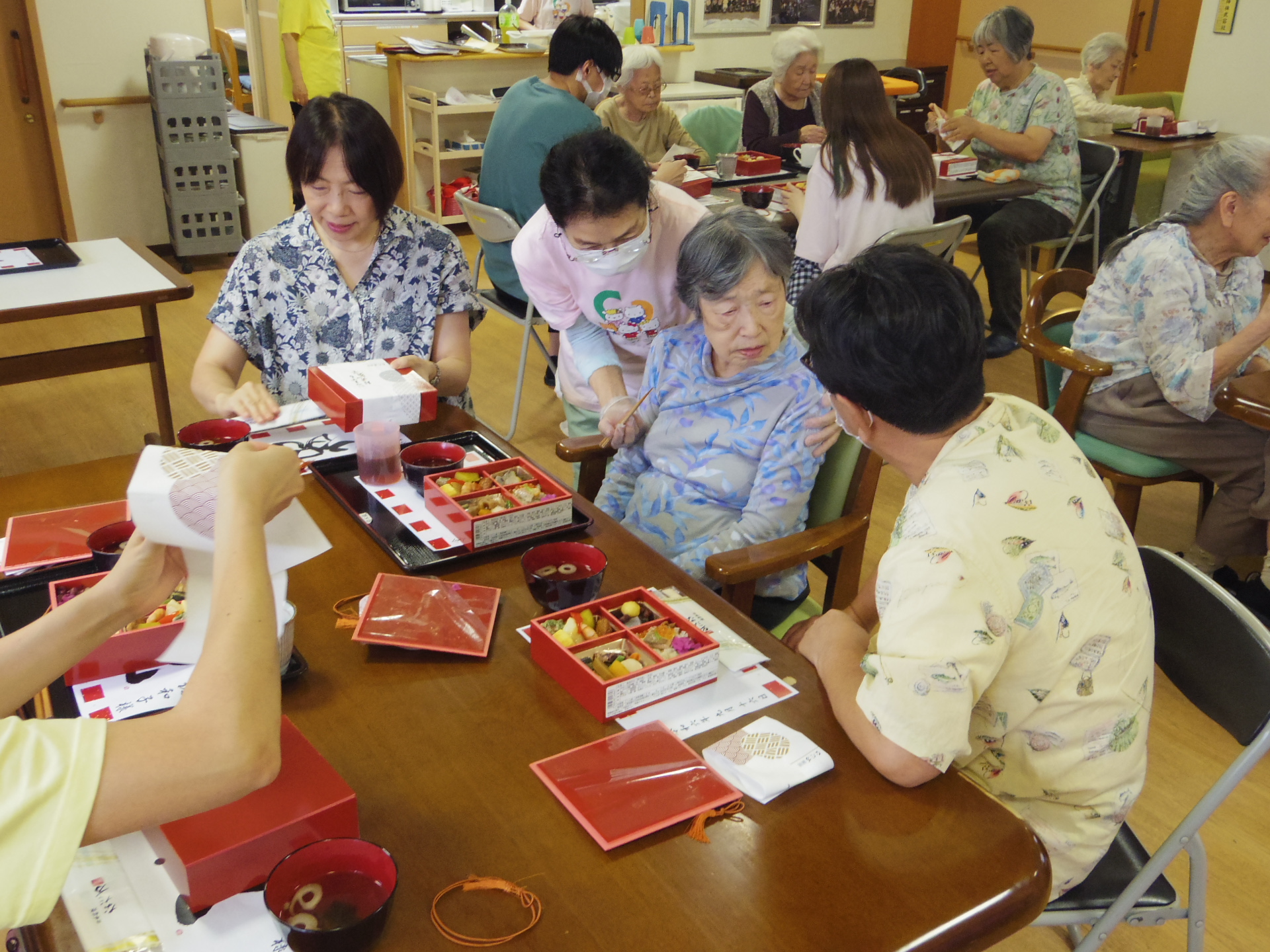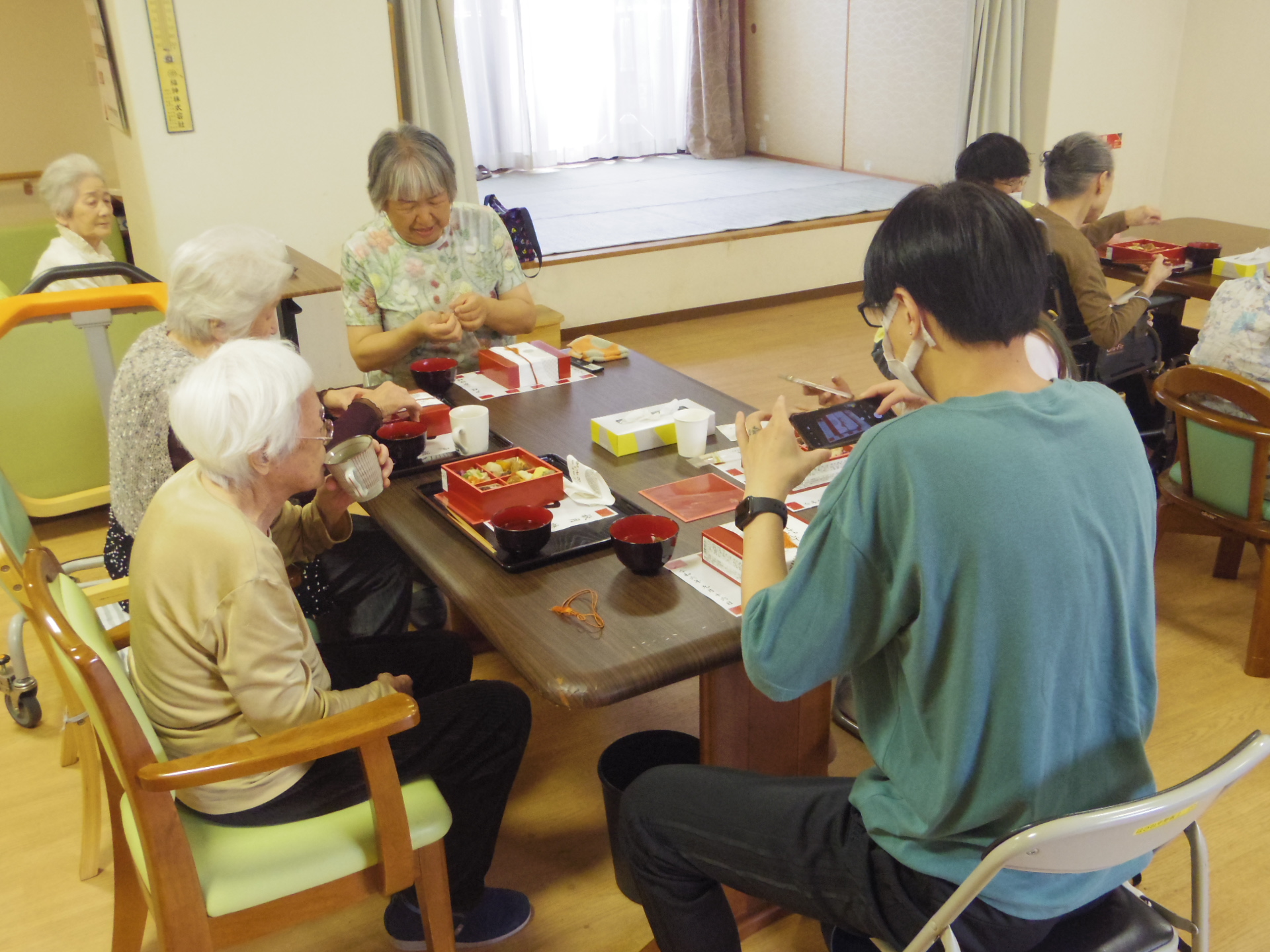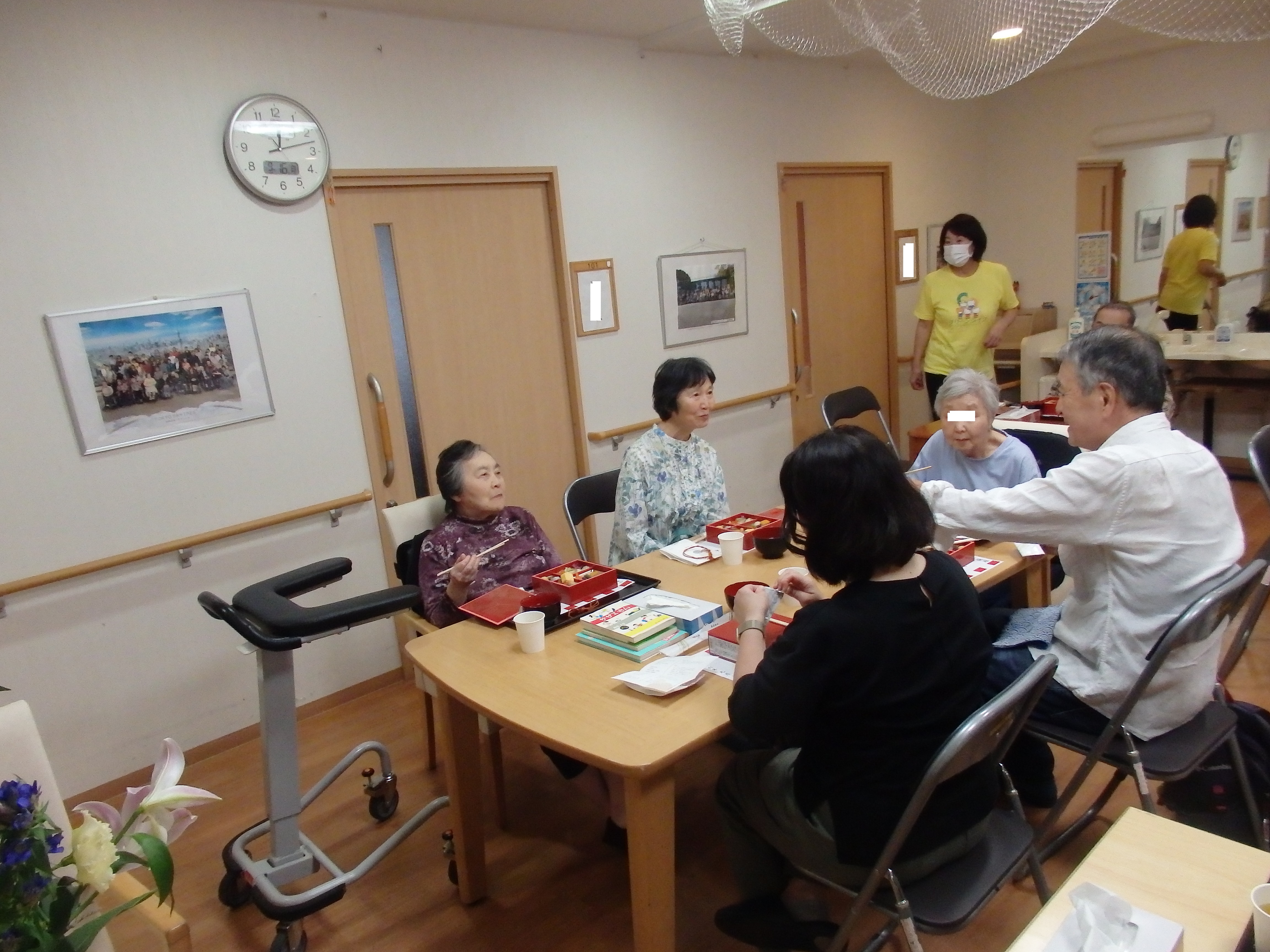 昼食会では、入居者様とご家族の方々とスタッフも一緒に