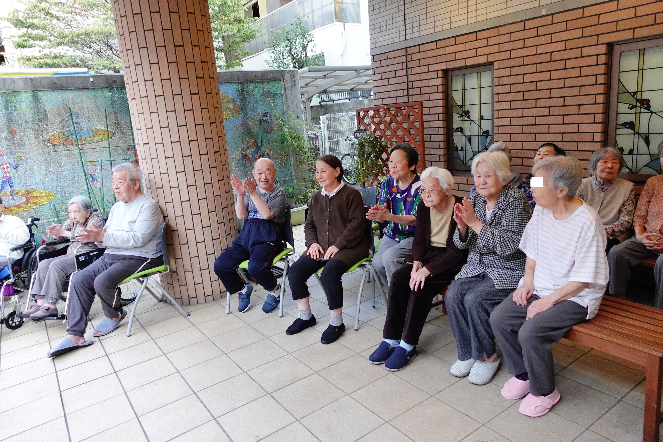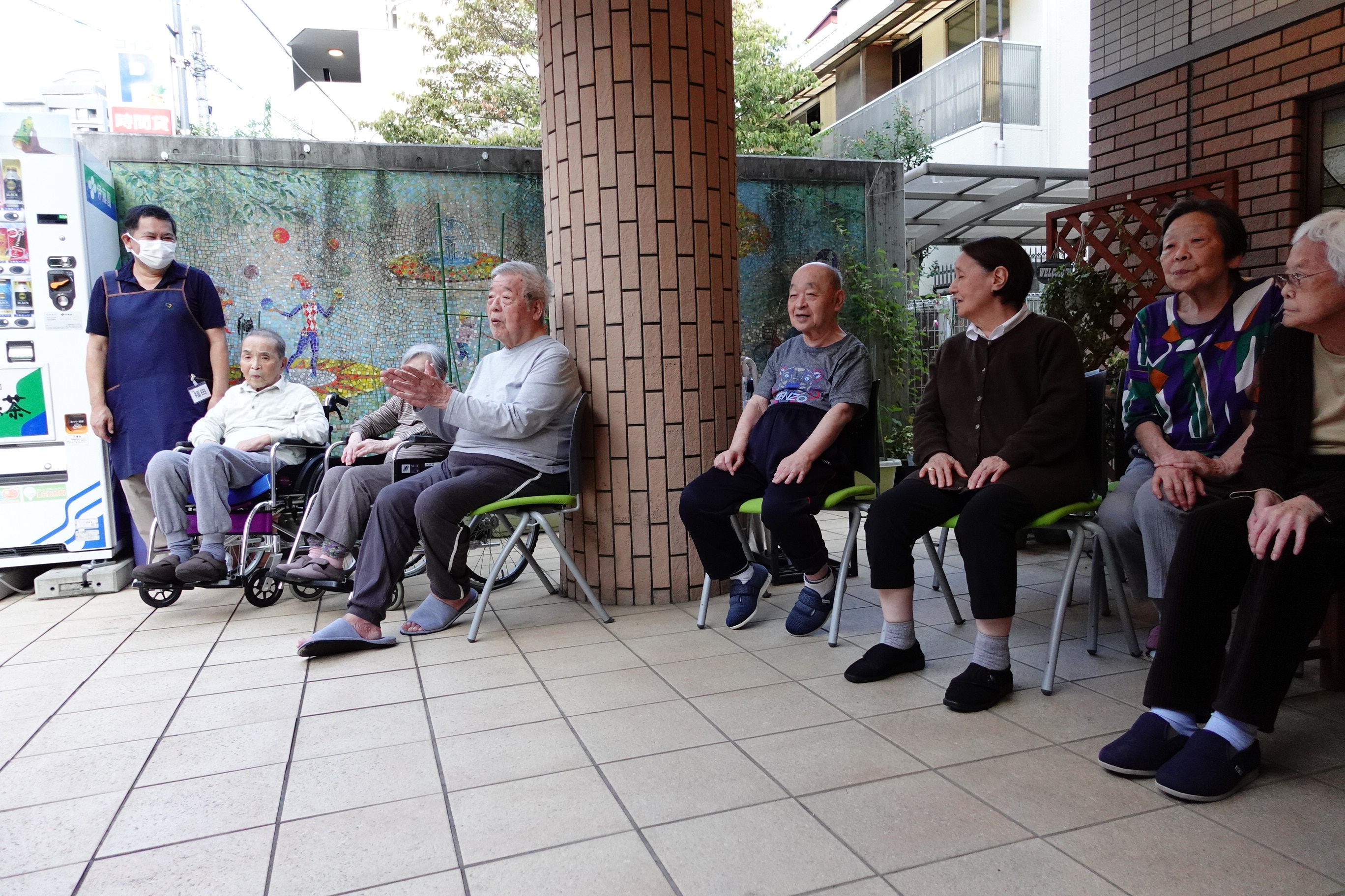 女性入居者様3名で集まって玄関先のベンチに座られて