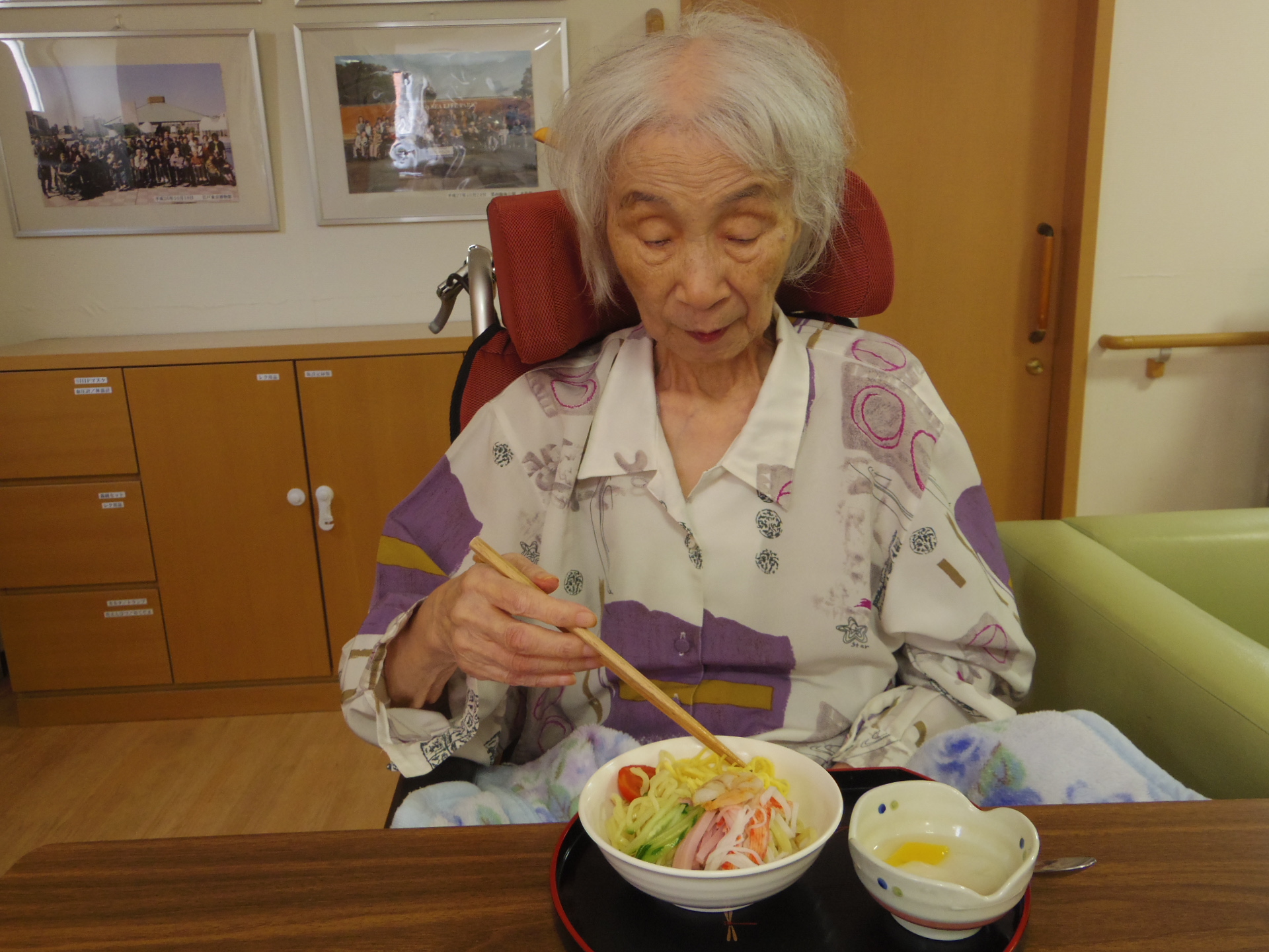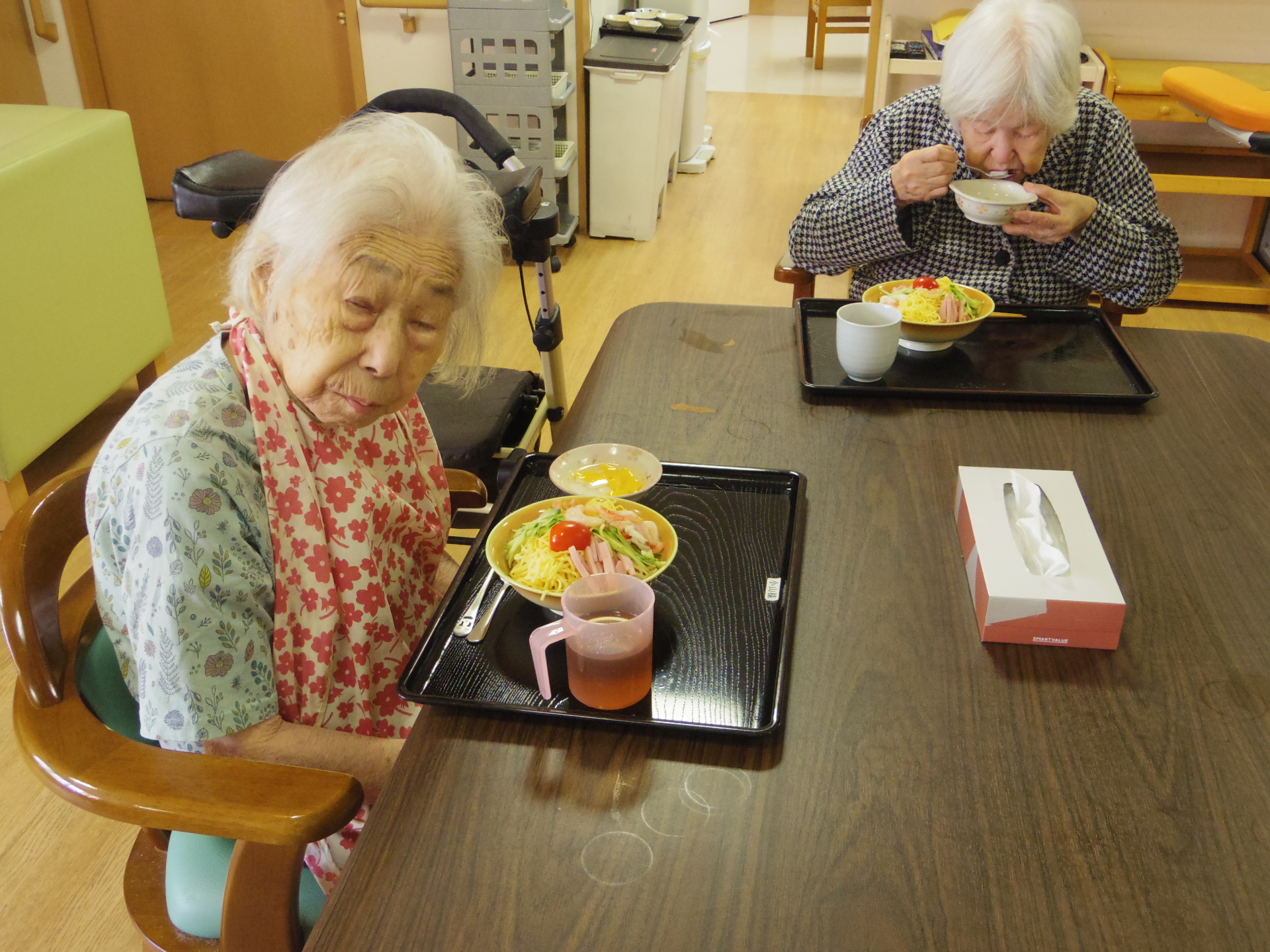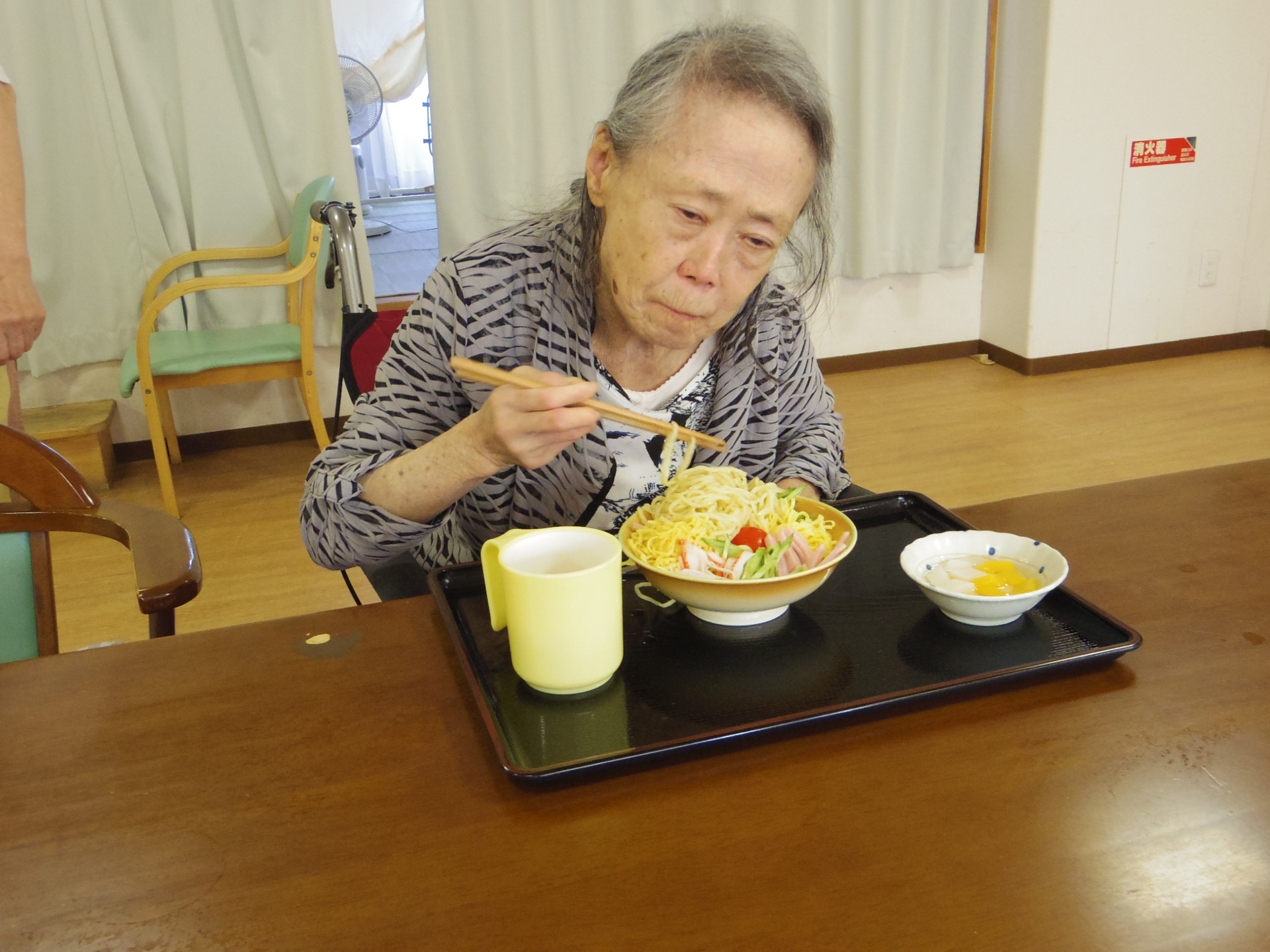 「あら、冷やし中華なんて久し振り!とっても美味しそうね♪」と