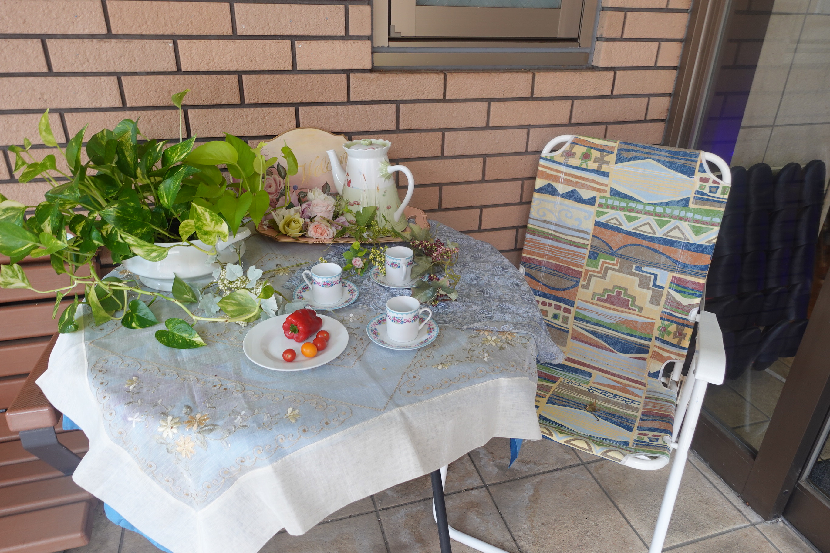 玄関前のテーブルも夏バージョンに模様替えしておりますので、