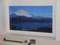 お風呂場入り口にのれん、お風呂には富士山の写真を