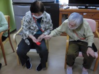 ご利用者16名が赤組と青組に分かれて、①スプーンリレー②新聞綱引き③玉入れで