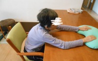 テーブルの上に置いた的にめがけて、勢いよく輪を投げました。
