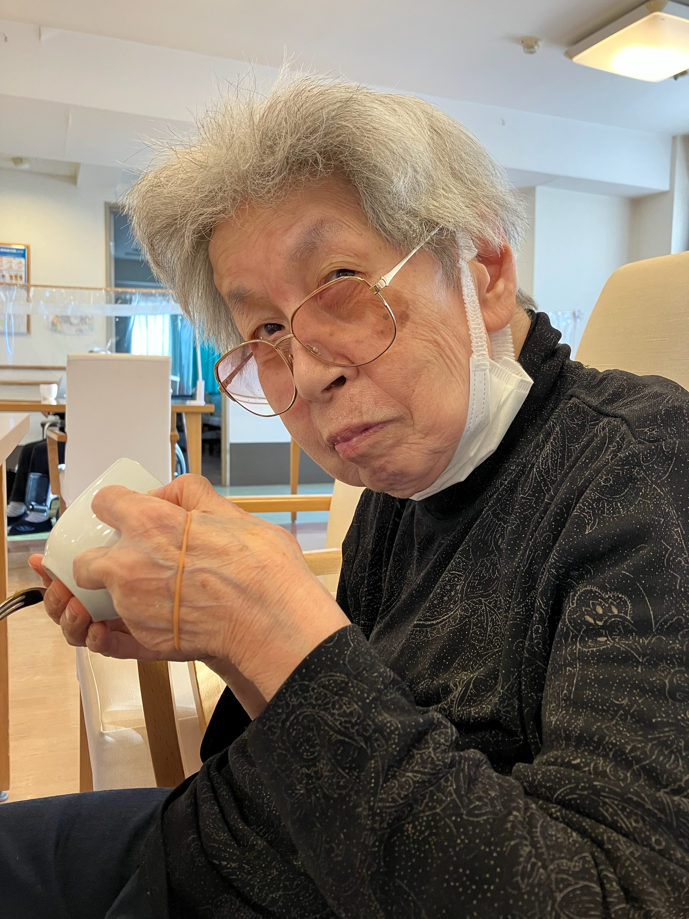 おやつのはちみつケーキを黙々と召し上がられていましたが、職員が「おいしいですか?」とお声がけするとニッコリ微笑んで「うん」と仰いました😀