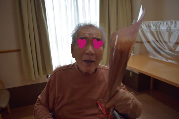 お花を受け取られた男性入居者様は嬉しそうにお花を眺めている方😄少し照れタ様子の方☺、中には感極まって涙を流される方もいらっしゃいました😭