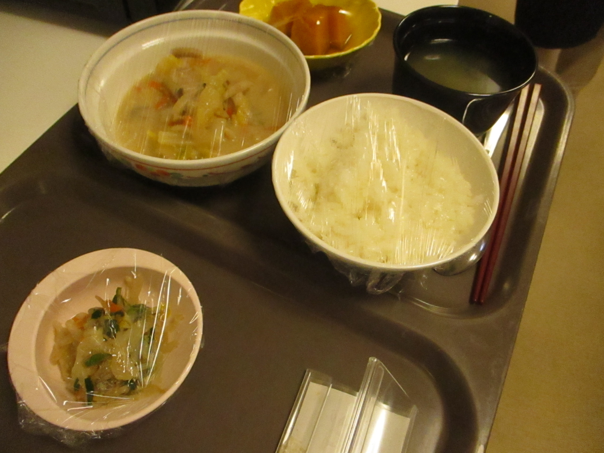 本日の夕食のメニューはご飯、味噌汁、鶏肉の豆乳煮込み、