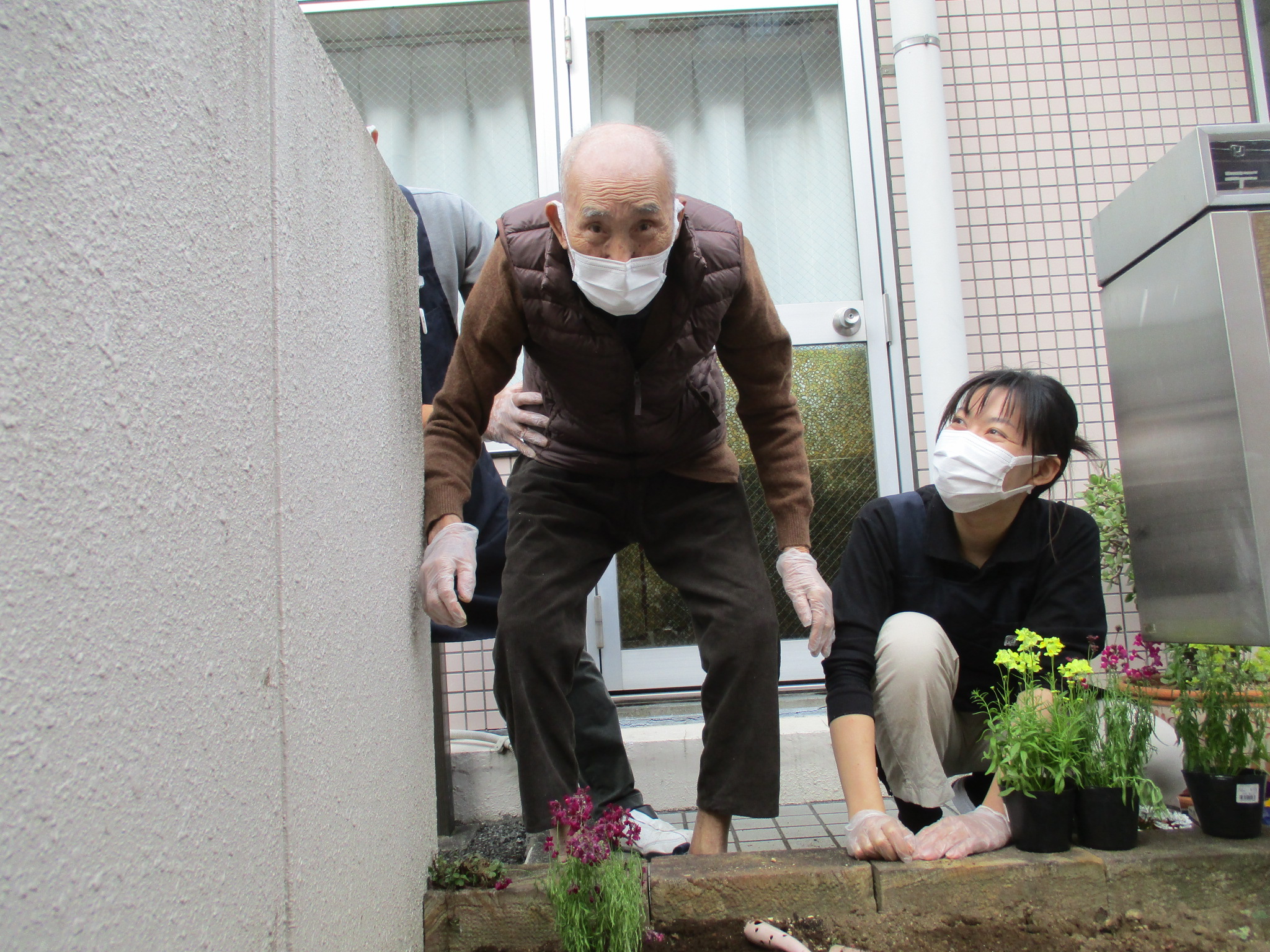 園芸が大好きな入居者様とスタッフで冬用のお花を植えました。