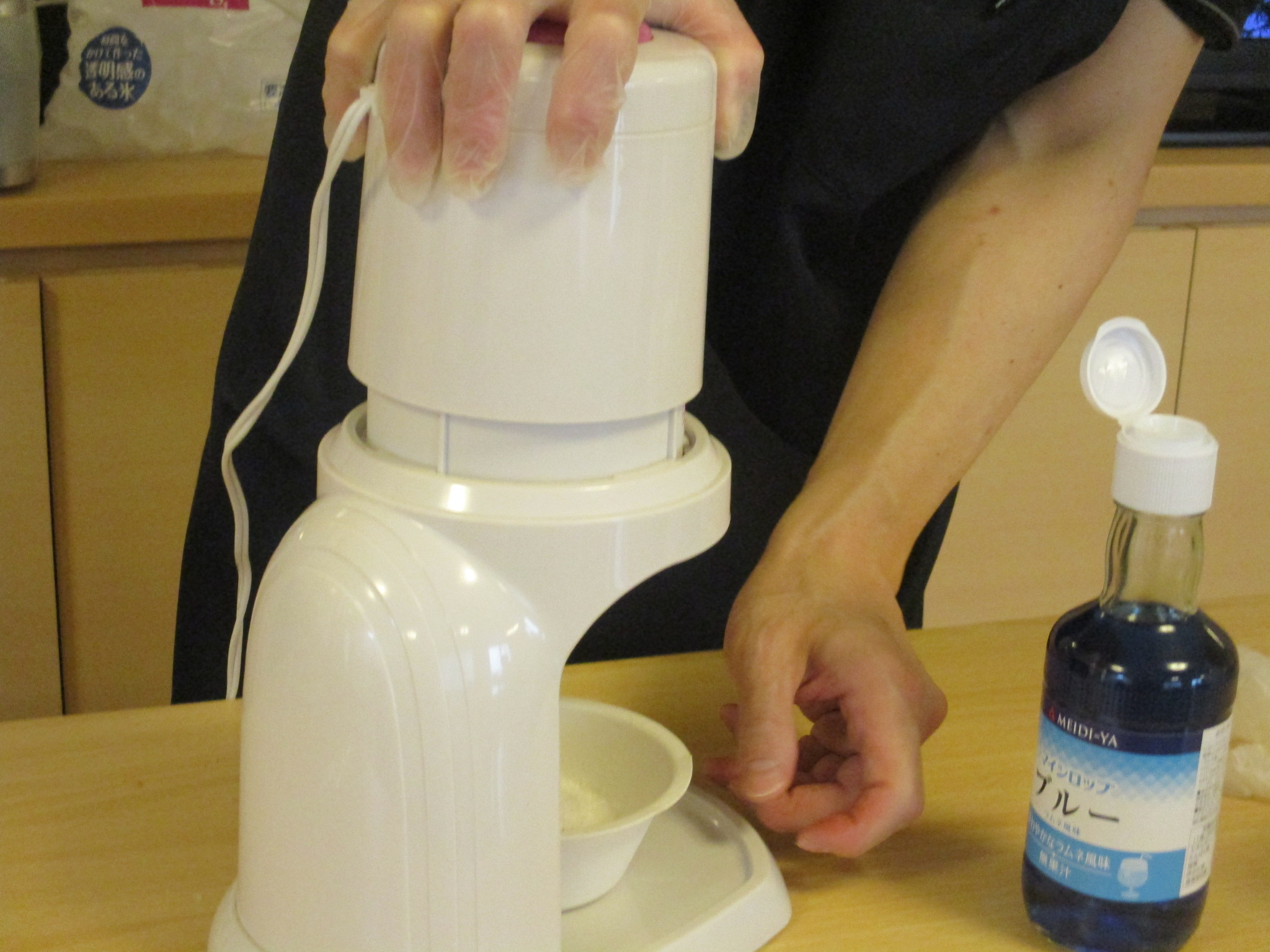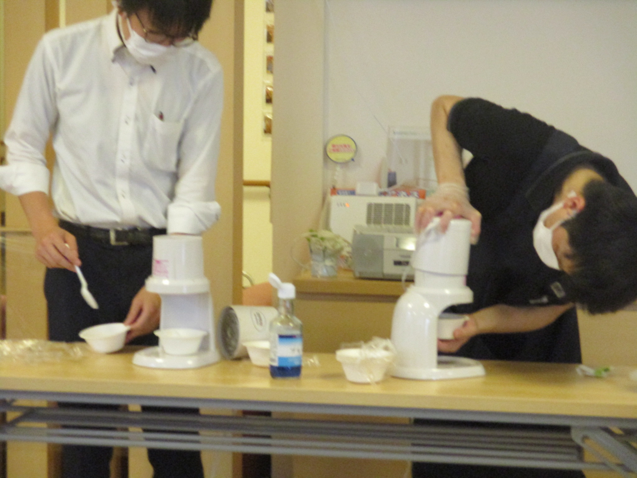 施設長とスタッフでかき氷機で一生懸命氷をかき、シロップをかけ