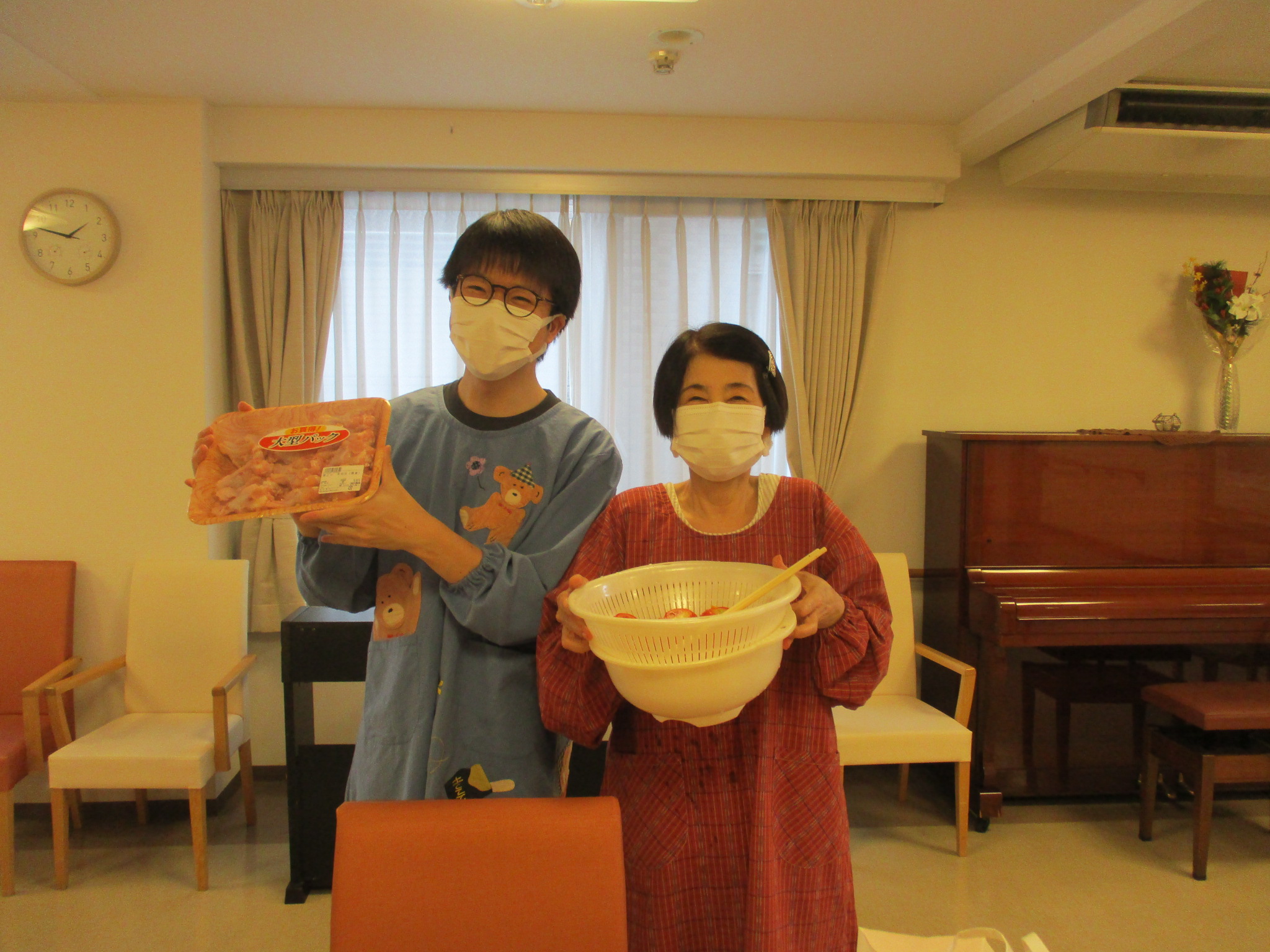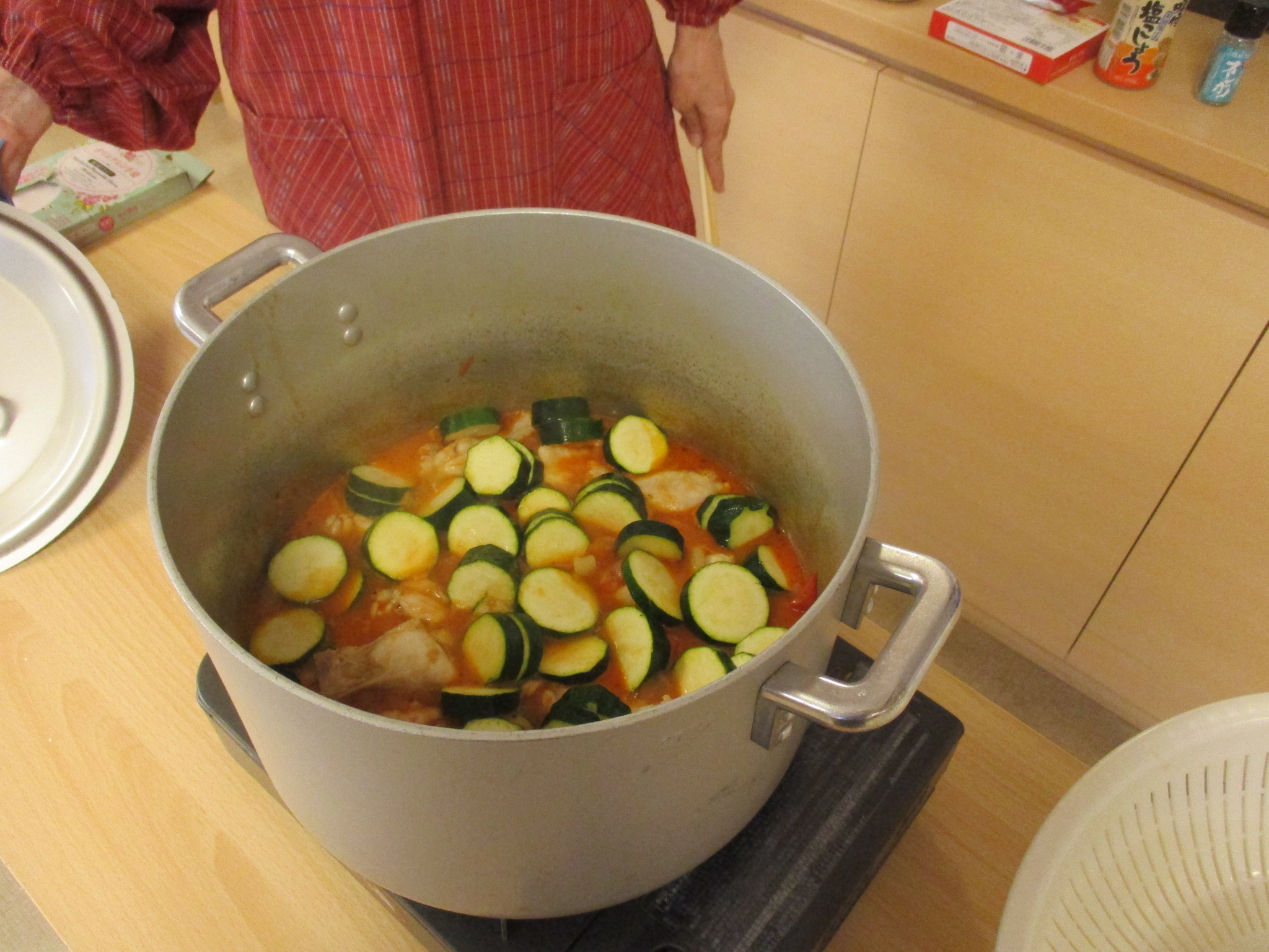 夏野菜のズッキーニやトマトを使用した鶏肉料理を作って、入居者と一緒に