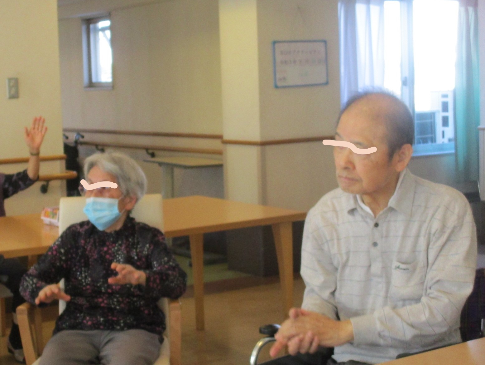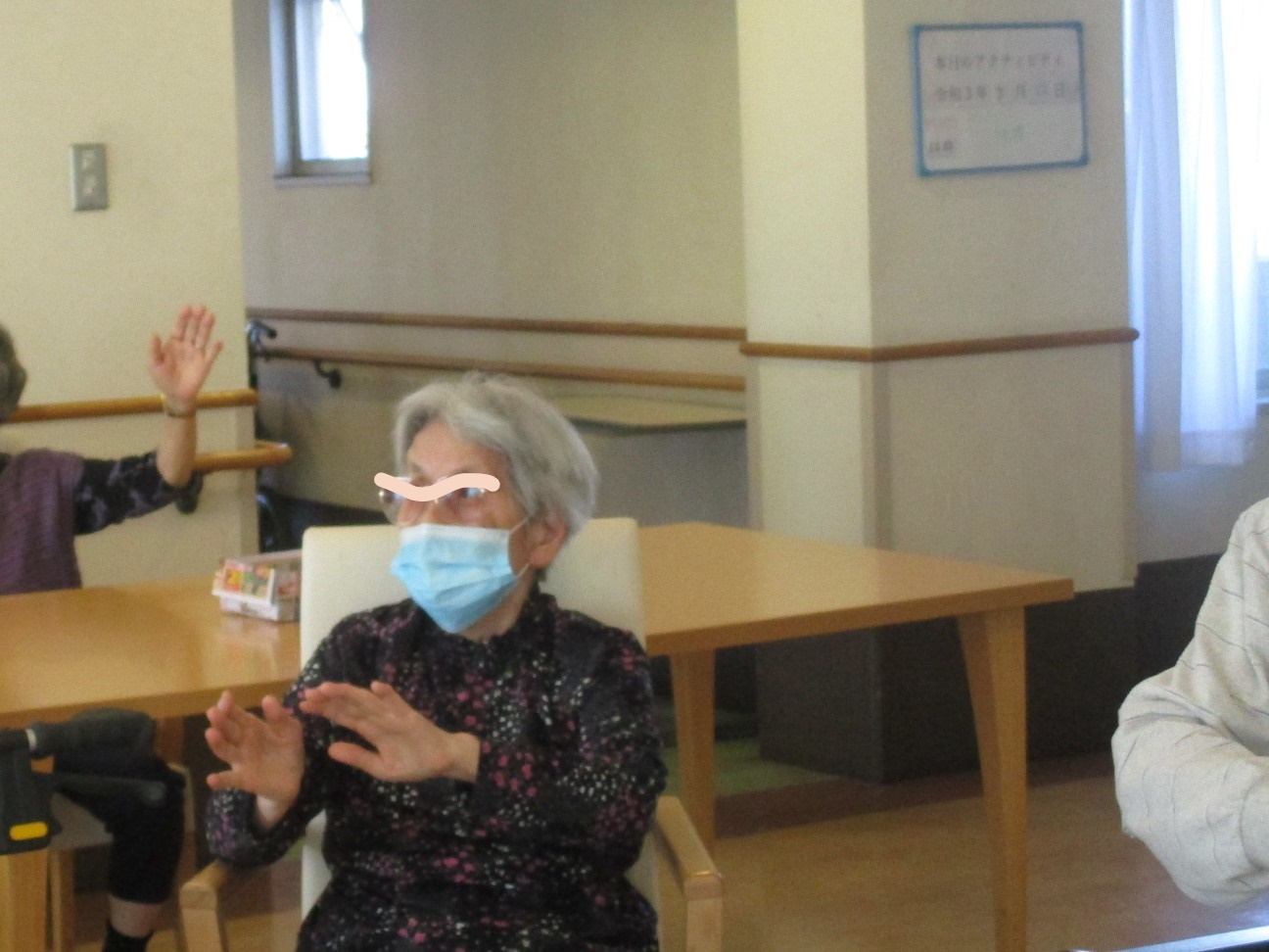 上半身を車椅子上で動かしたり、隣の方と一緒に真似てみたりと一生懸命に