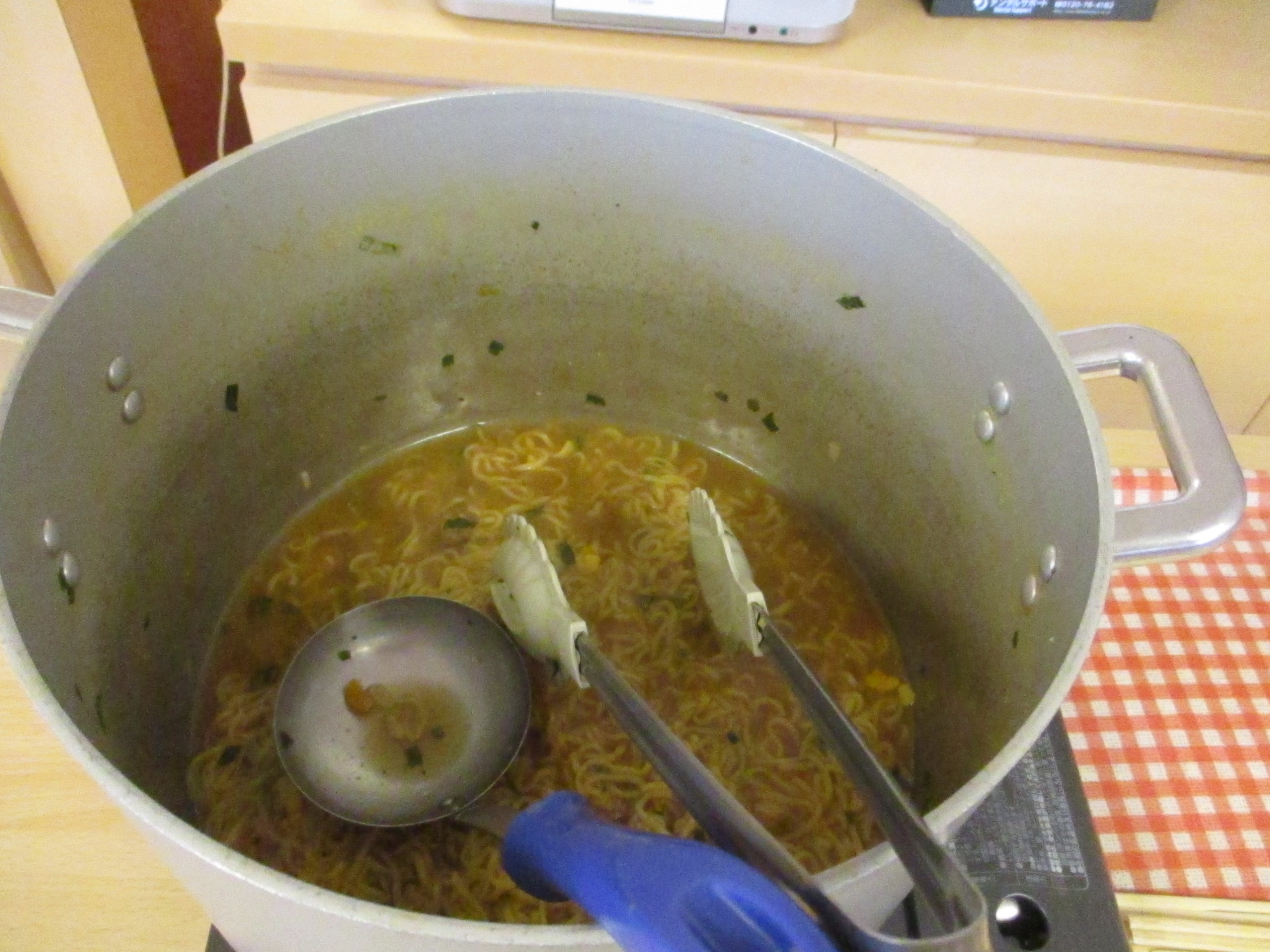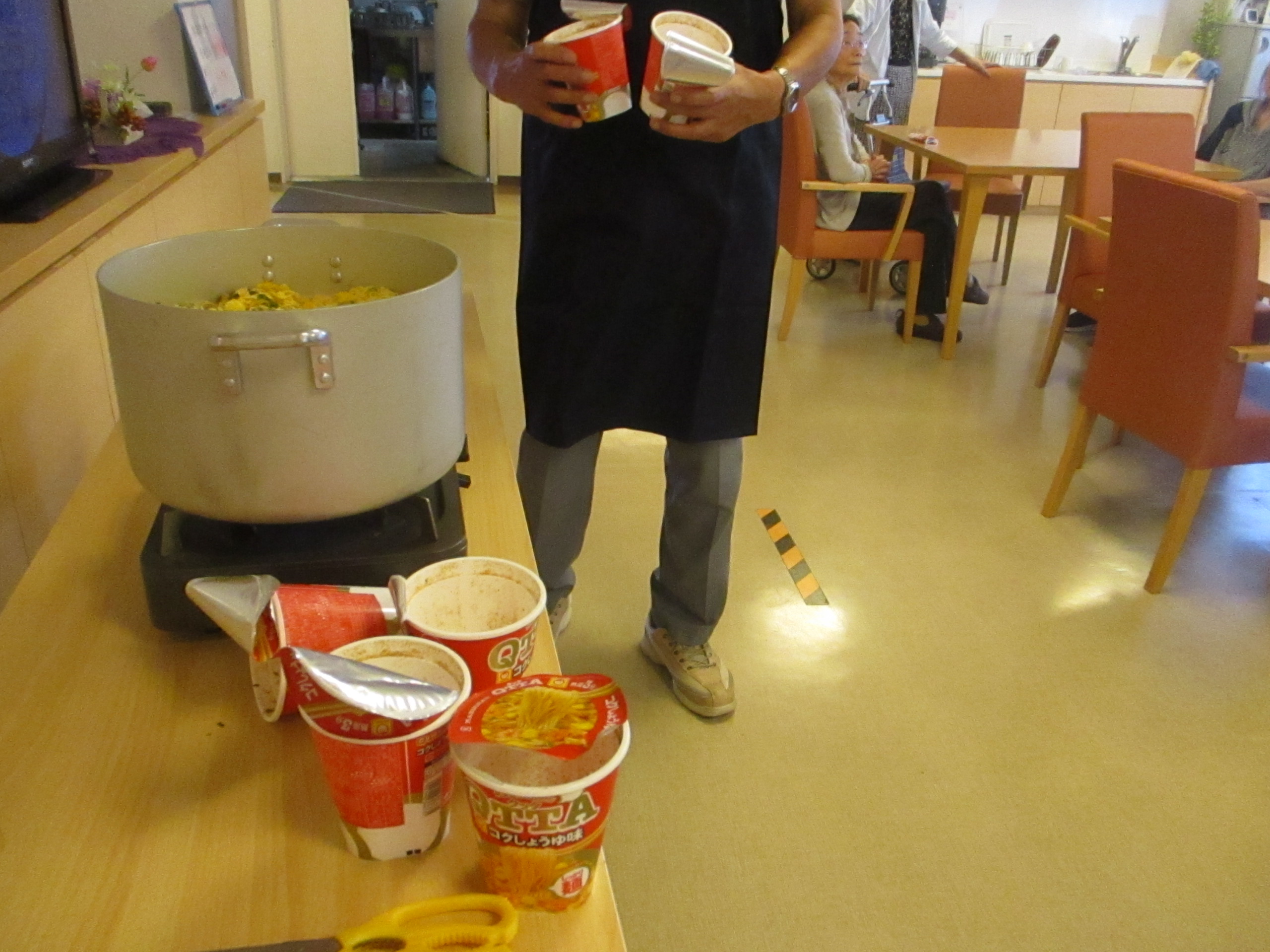 本日は、皆さんでスタッフと一緒にカップラーメンを鍋で煮て分けて