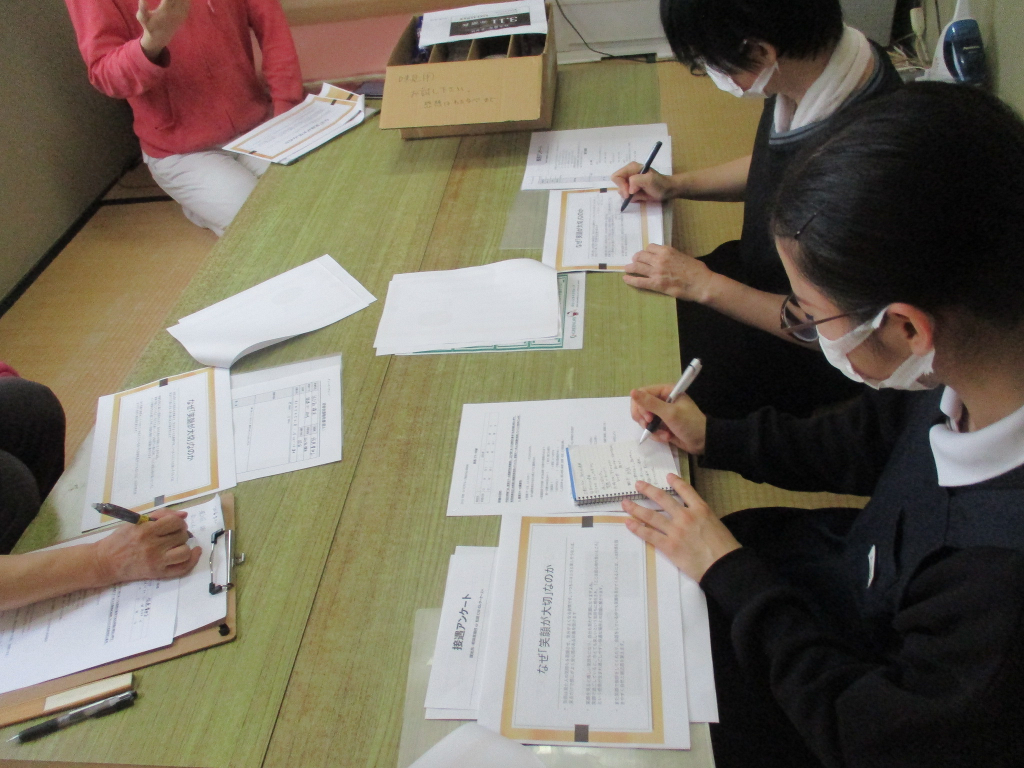 トレーナーであるスタッフと一緒に接遇・マナーの資料を見ながら