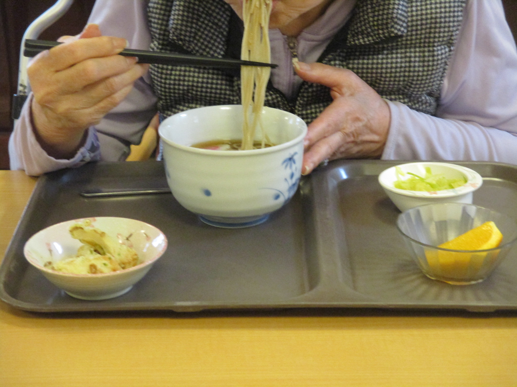 本日の昼食はかきたまそばでちくわの天ぷら添えです。