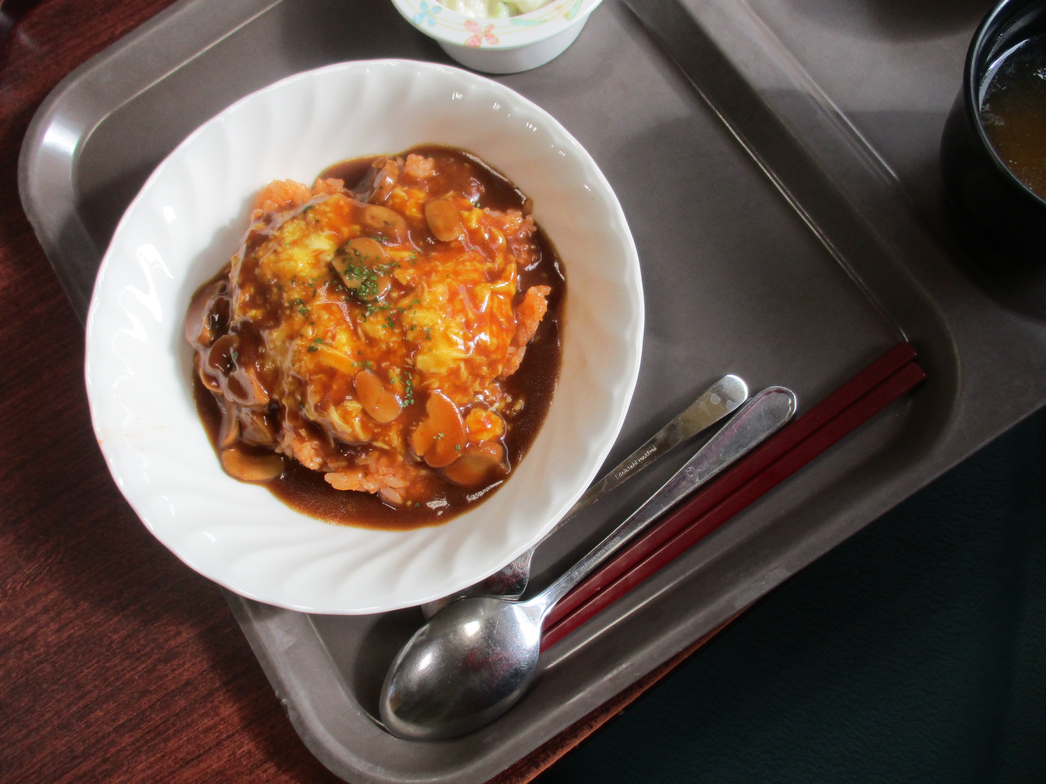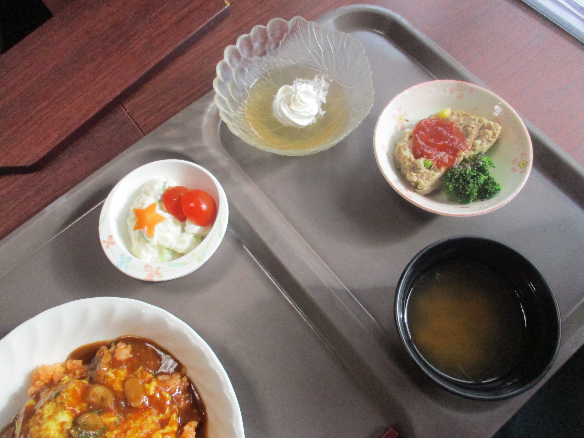 ”オムライスデミソース、コーンスープ、ミートローフ、カラフルサラダ、ババロアでした。