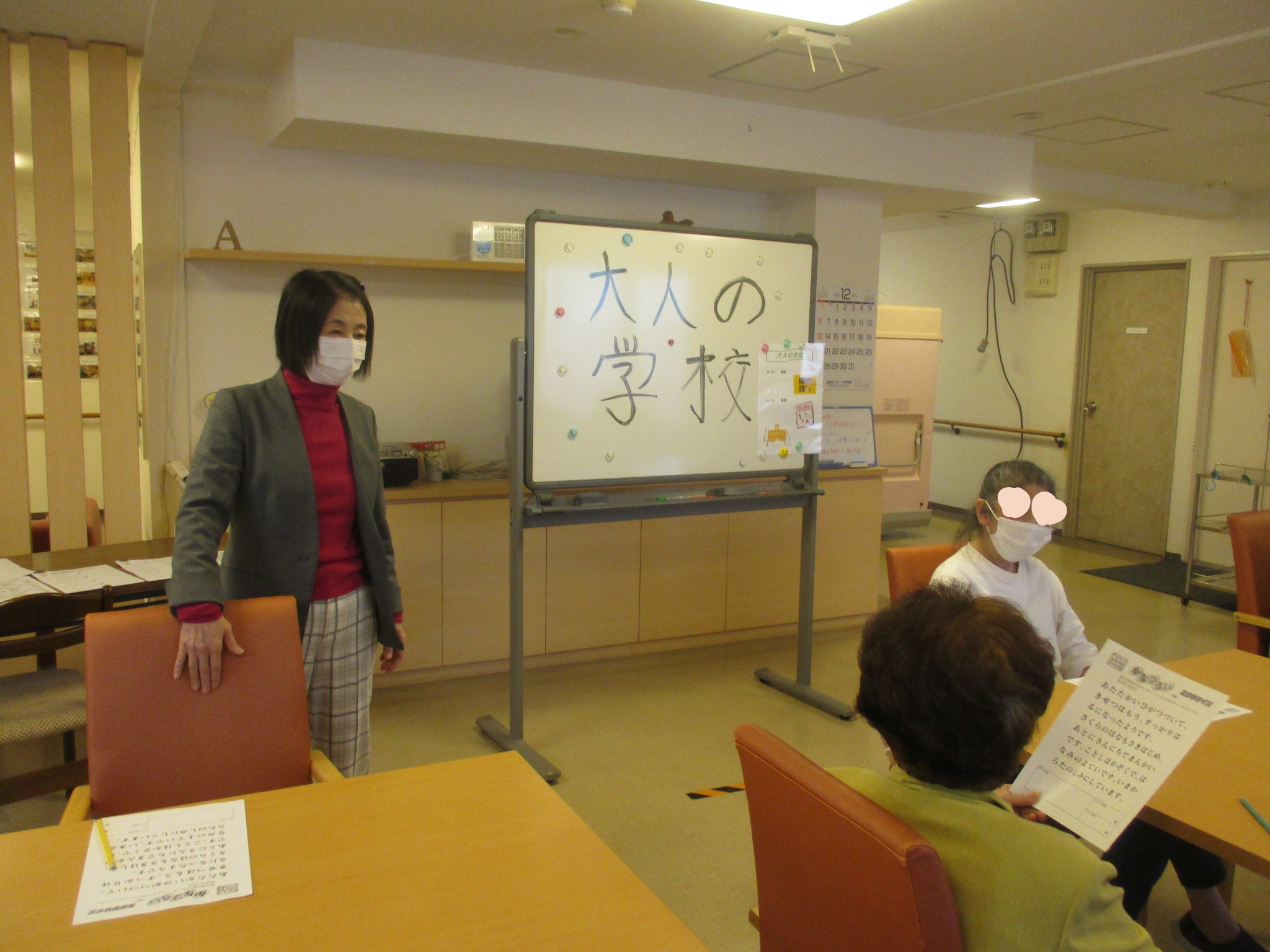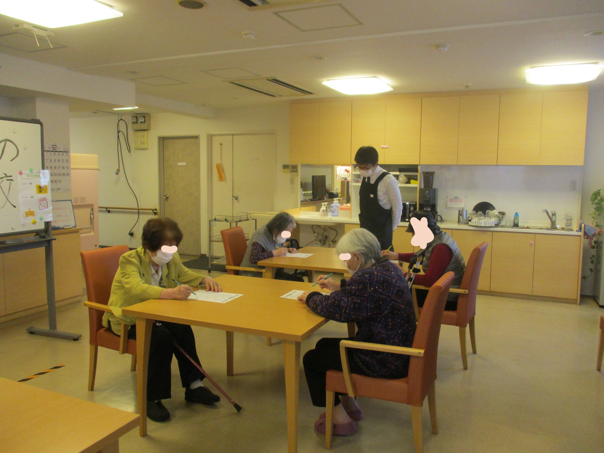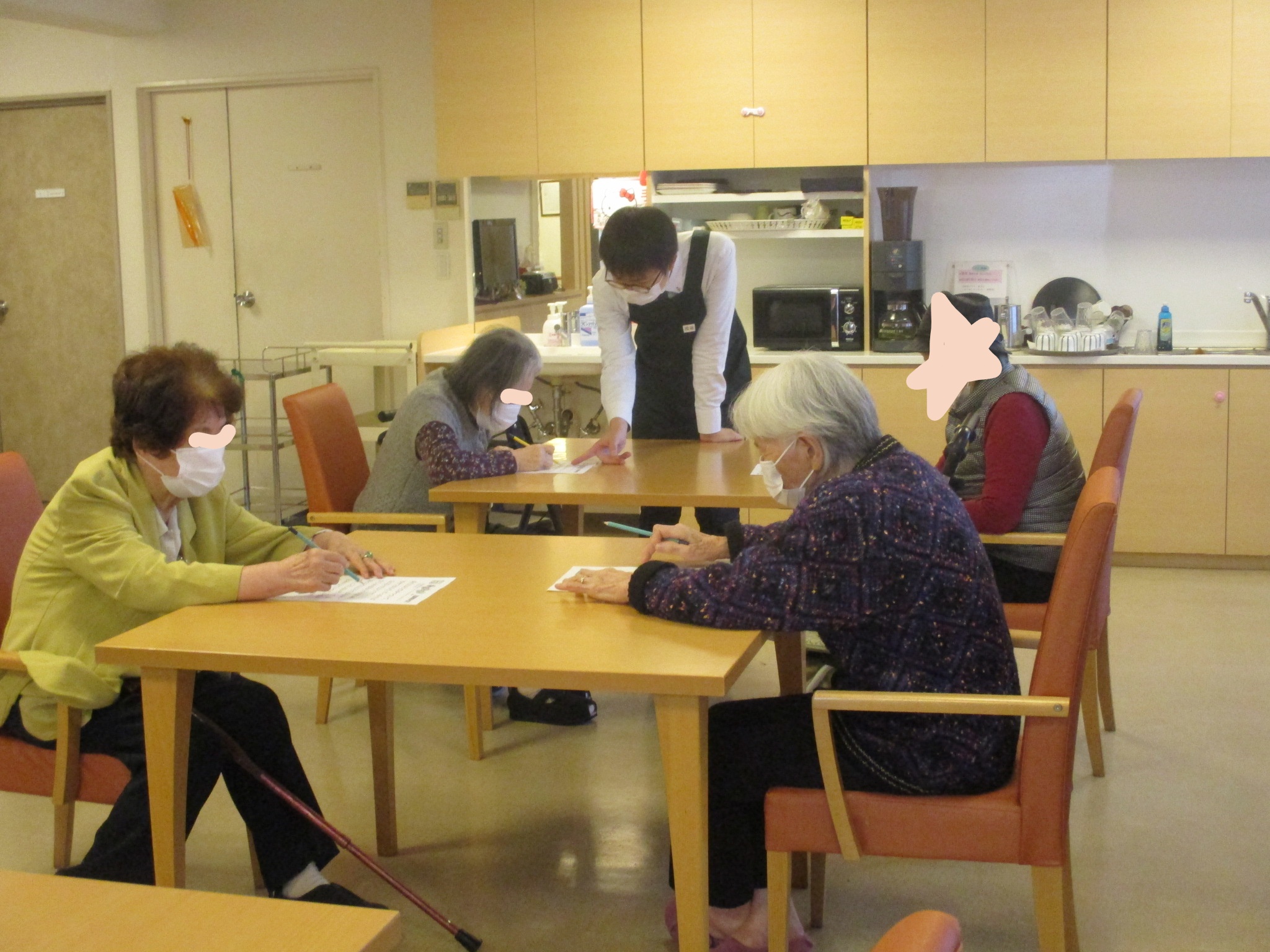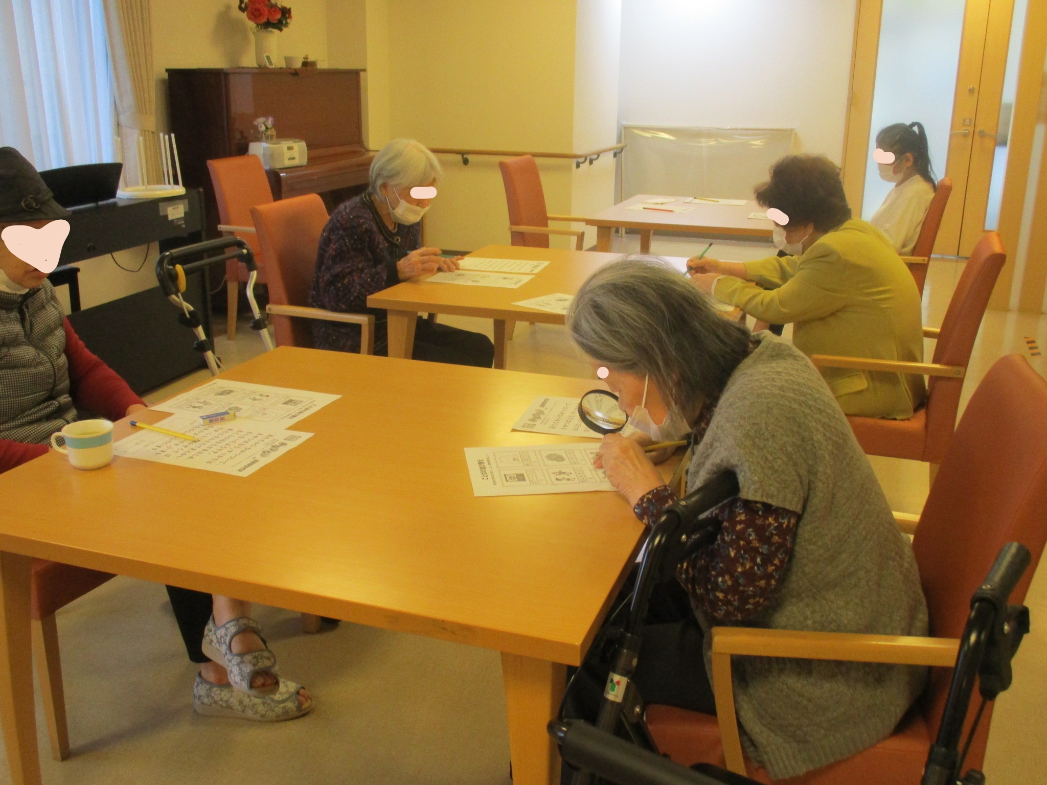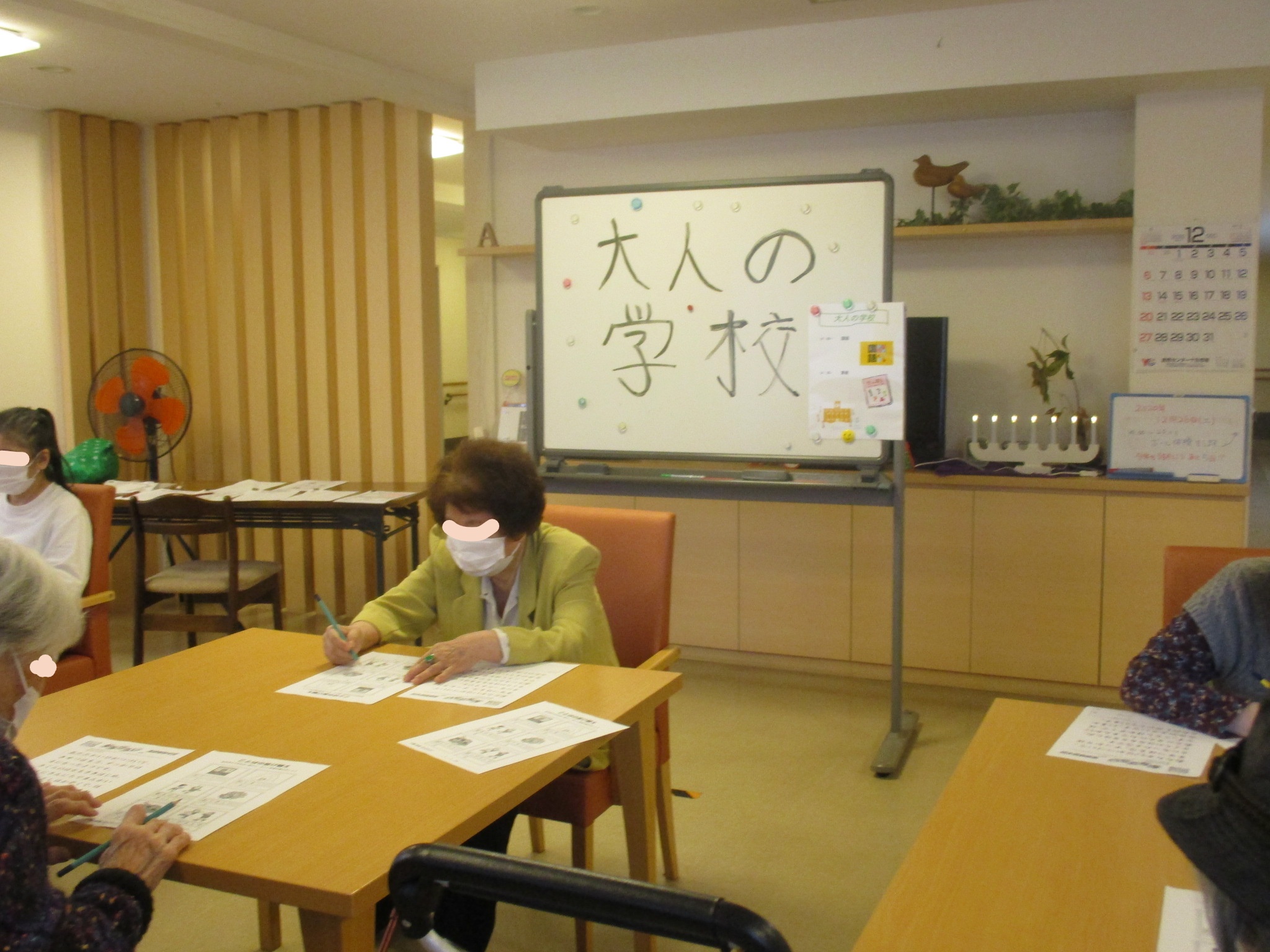 今回は1.2階の入居者様数名で一時間目国語、2時間目算数を行いました。
