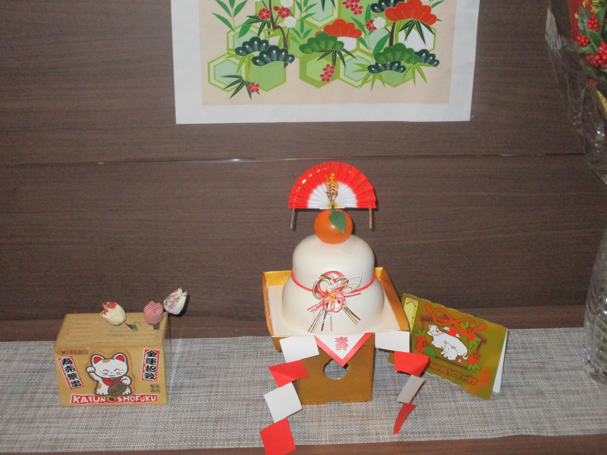 エントランスには、ミニ門松とお供え餅、賽銭箱にお正月のお花、入り口には水引飾りを飾りました。