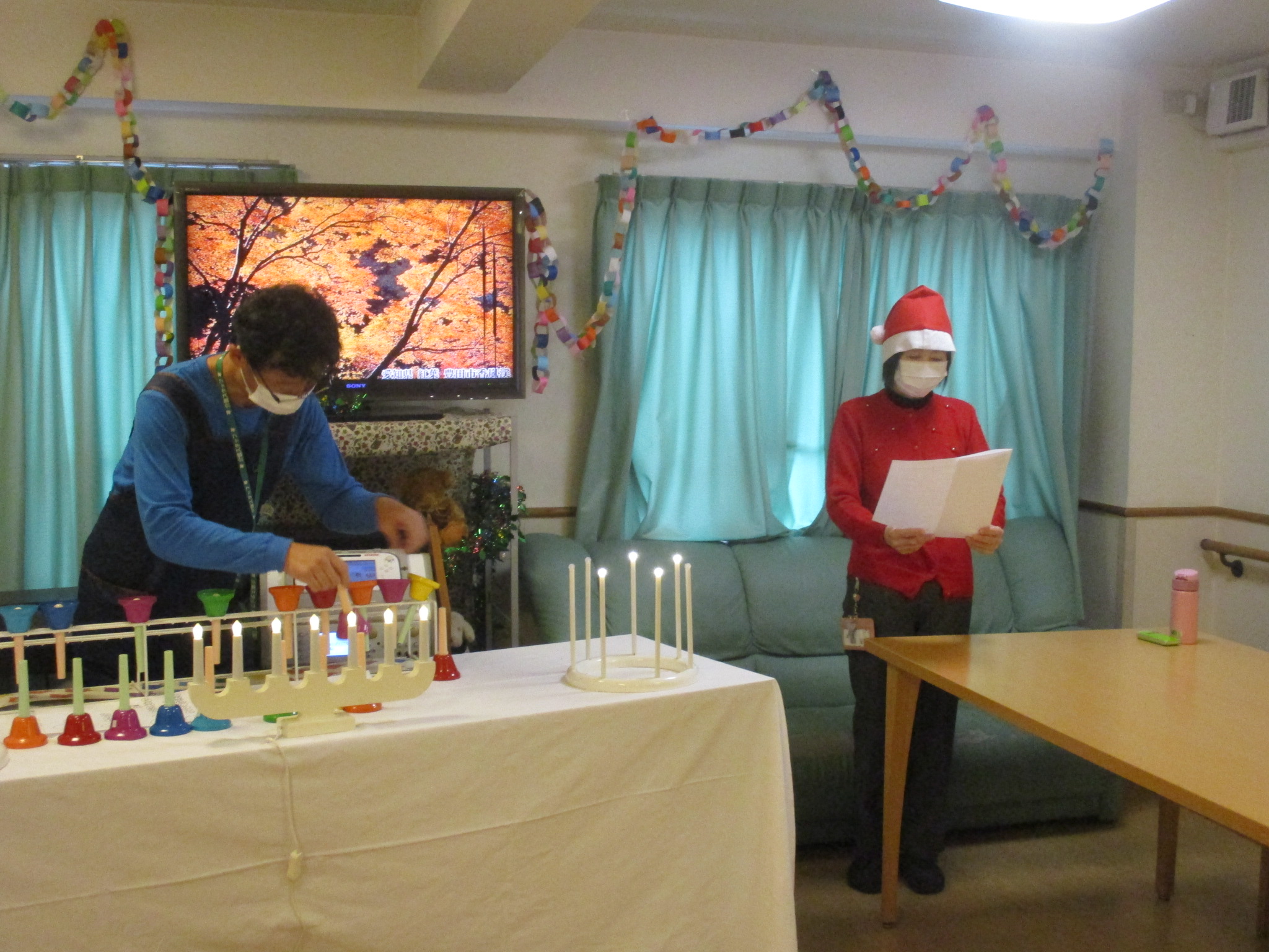 ハンドベルとクリスマスソングに合わせて職員がダンスを行いました。