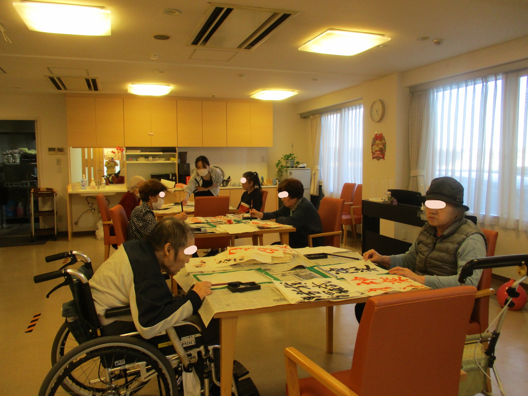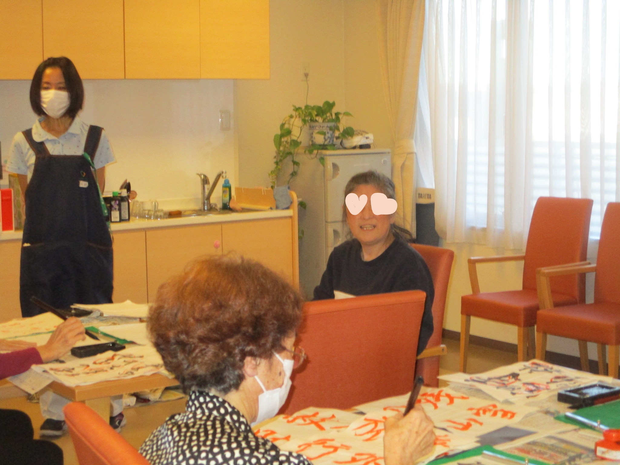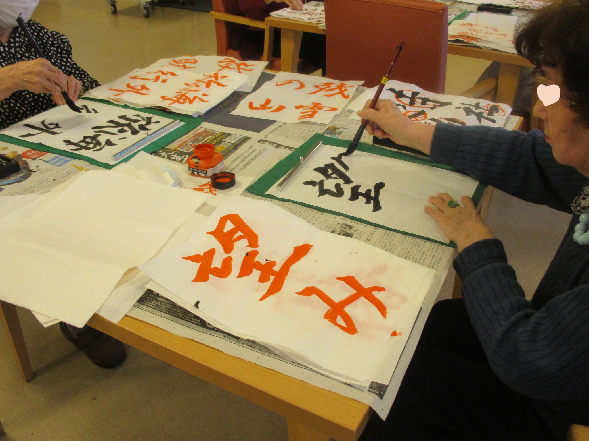 本日は、午後から一階で感染防止を行いながら書道教室を行いました。
