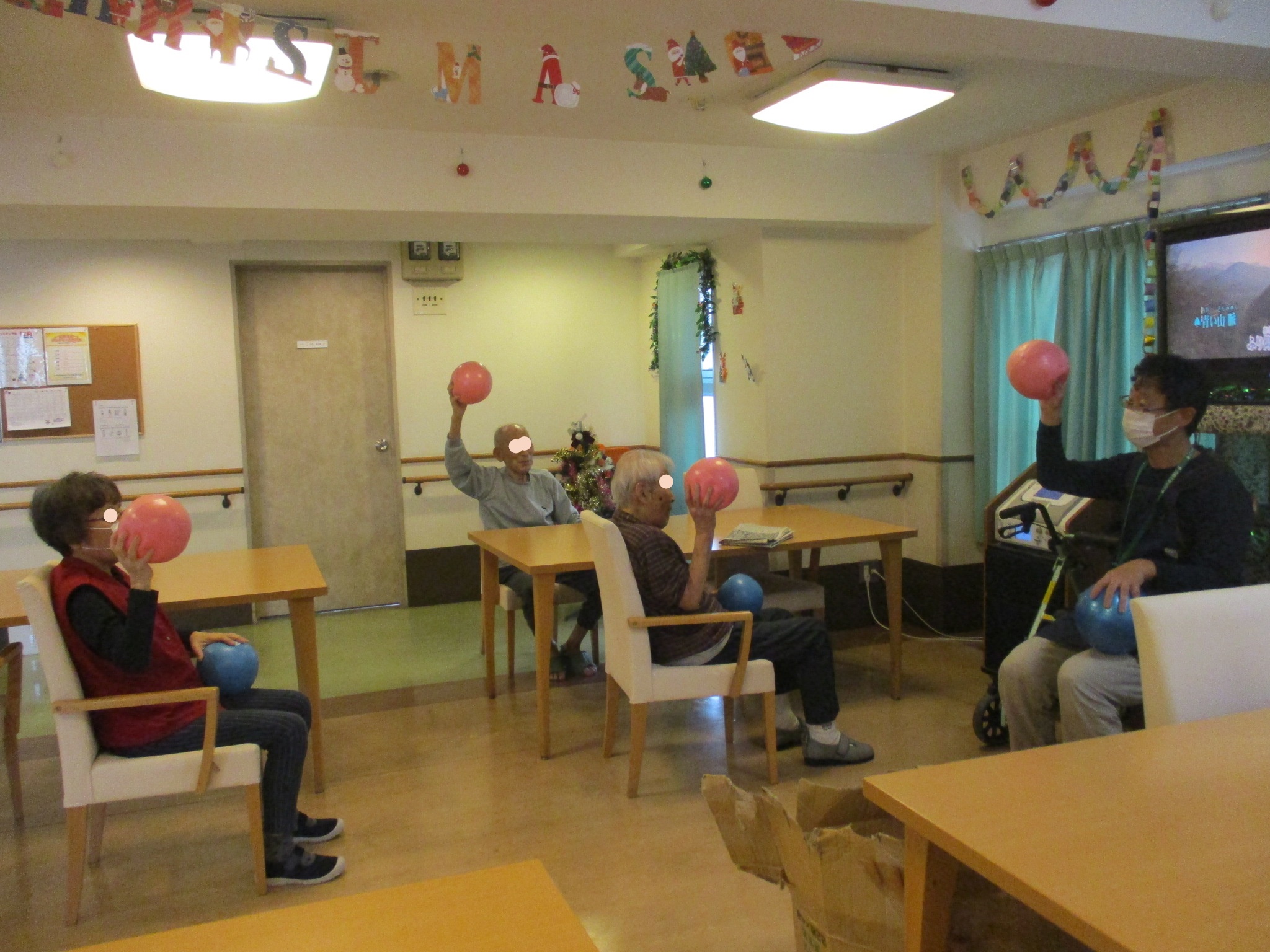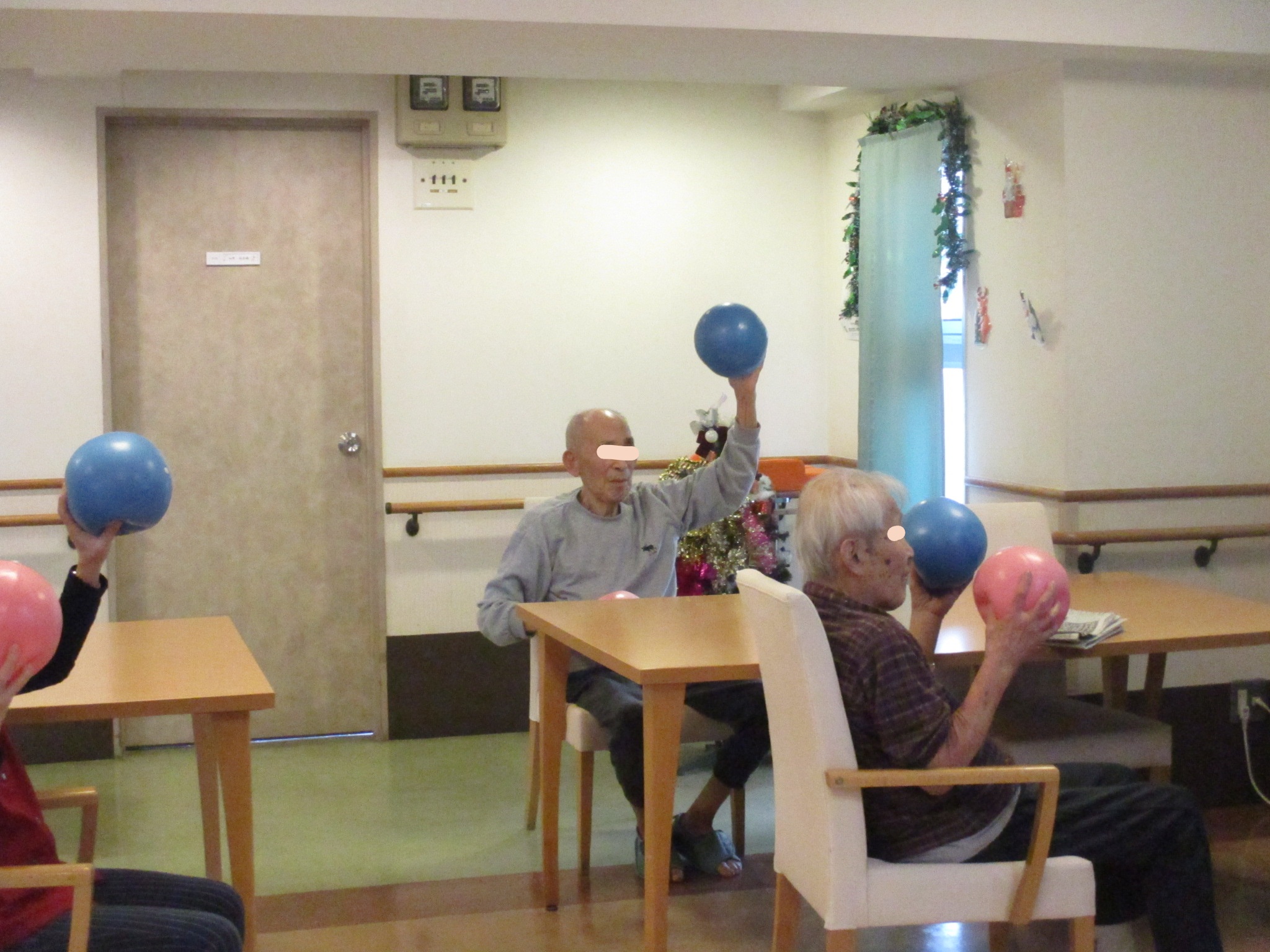 スタッフと一緒に赤と青のボールをもって脳トレです。