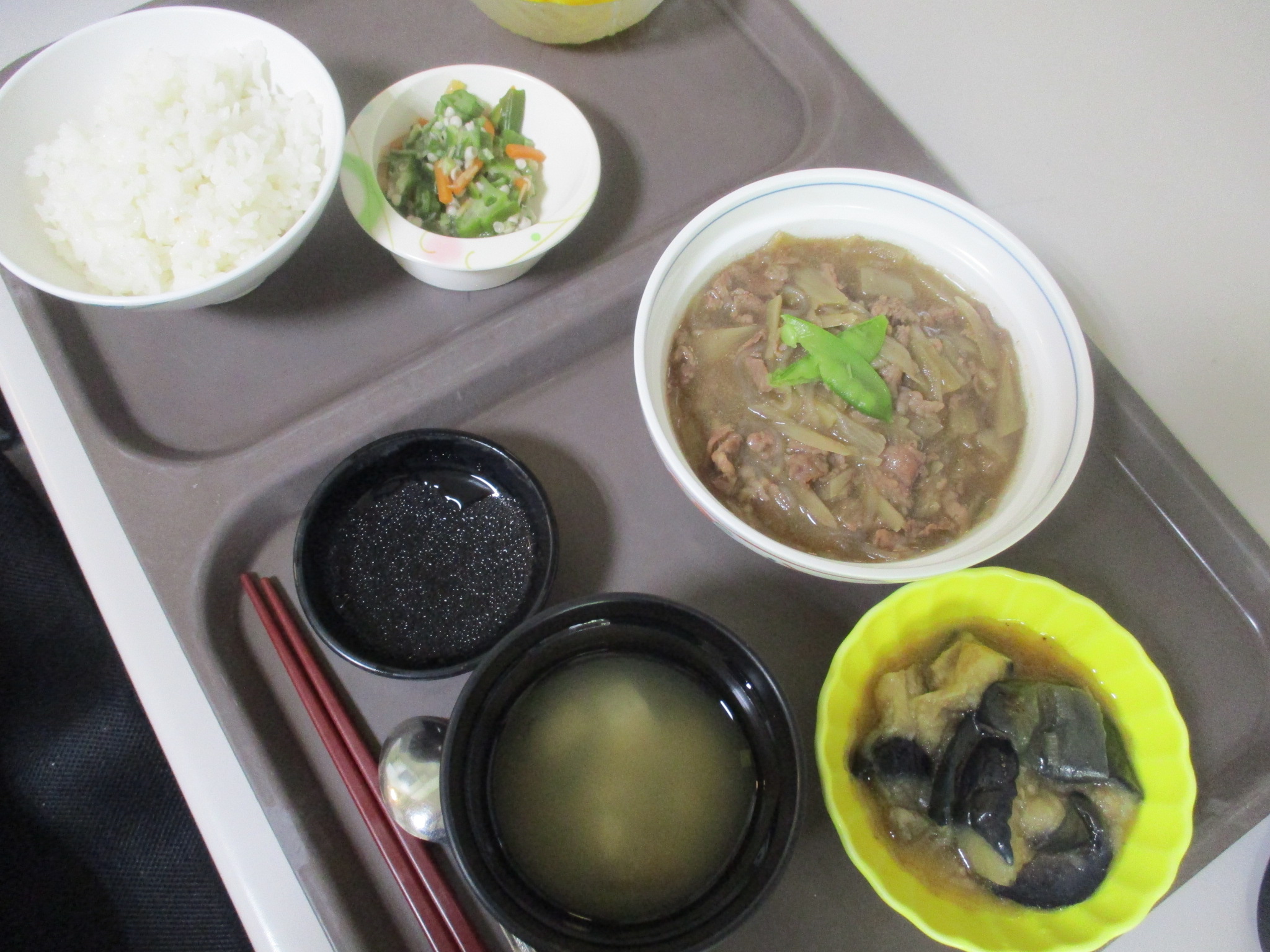 はぴね横浜:本日の昼食は牛肉のしぐれ煮、ナスのねぎたれ、なめ茸和え、フルーツです。