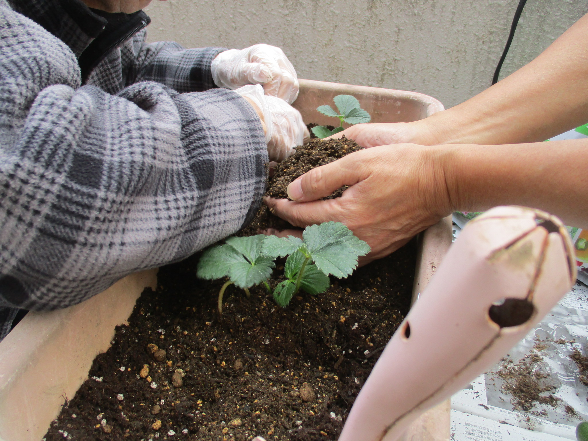 本日は、はぴね横浜の庭で園芸が大好きな入居者様といちごの苗を植えました。
