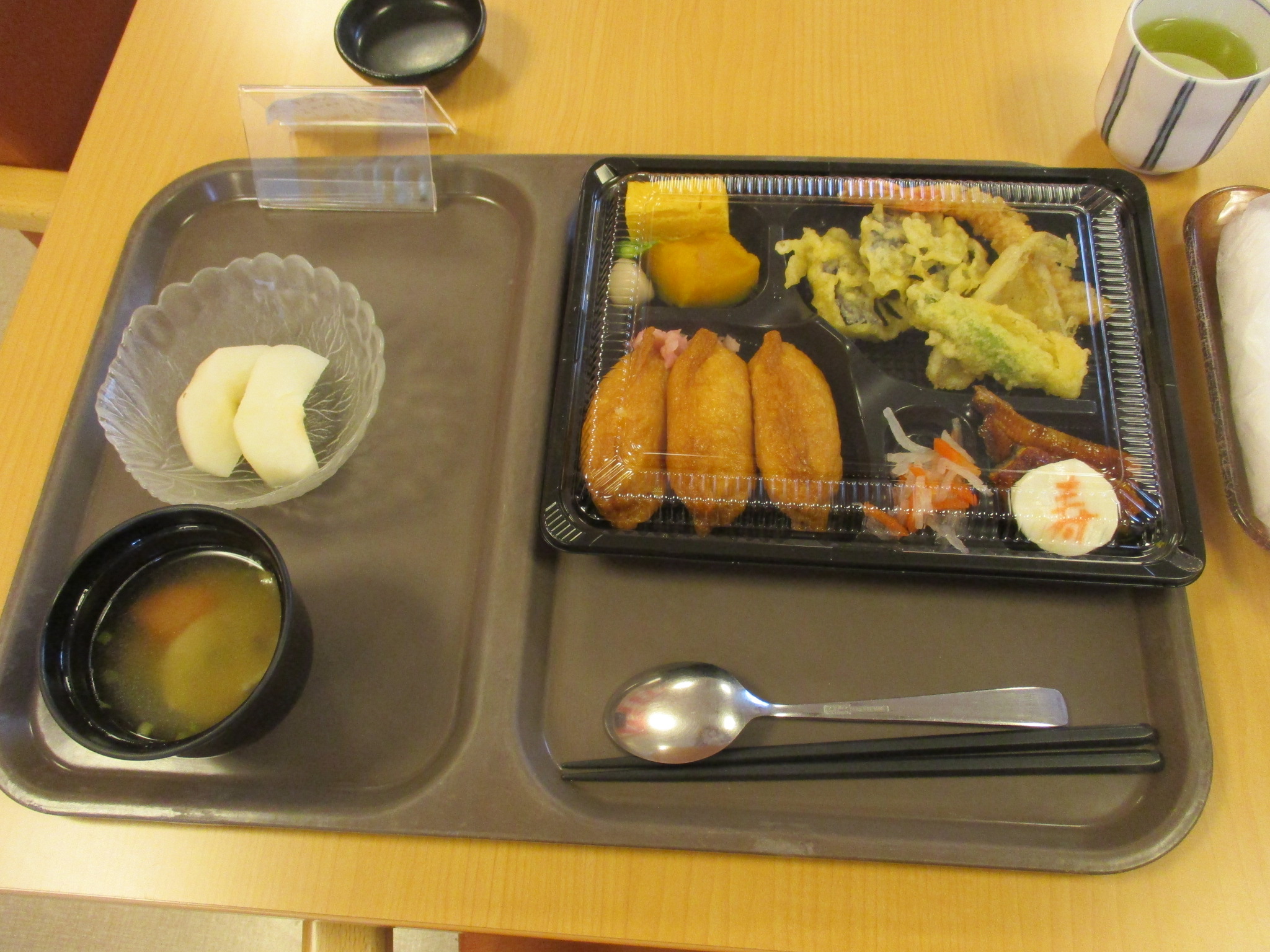 昼食は豪華な松花堂弁当、いなり寿司、鰻、天ぷら、かまぼこ、煮物、なます、さつま汁、秋の果物の梨等