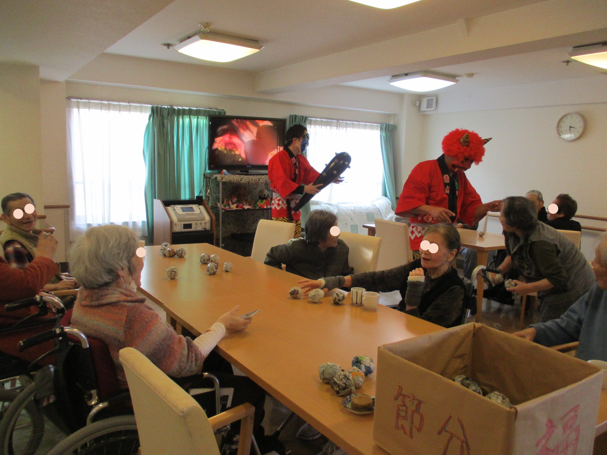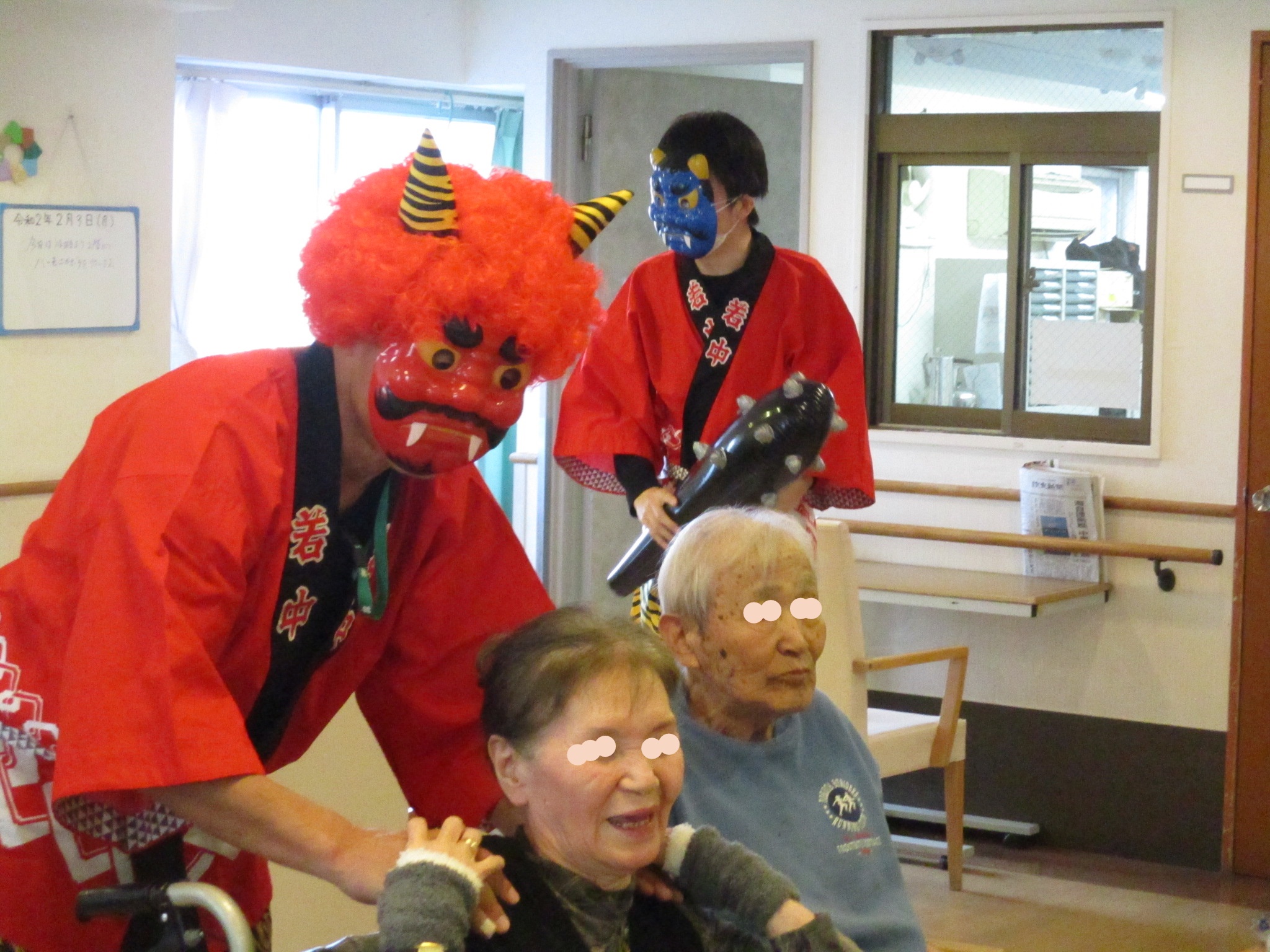 2月3日の節分は、施設長と職員が赤鬼、青鬼になり入居者様と「鬼は外、福は内」と各階を周り節分を楽しみました。