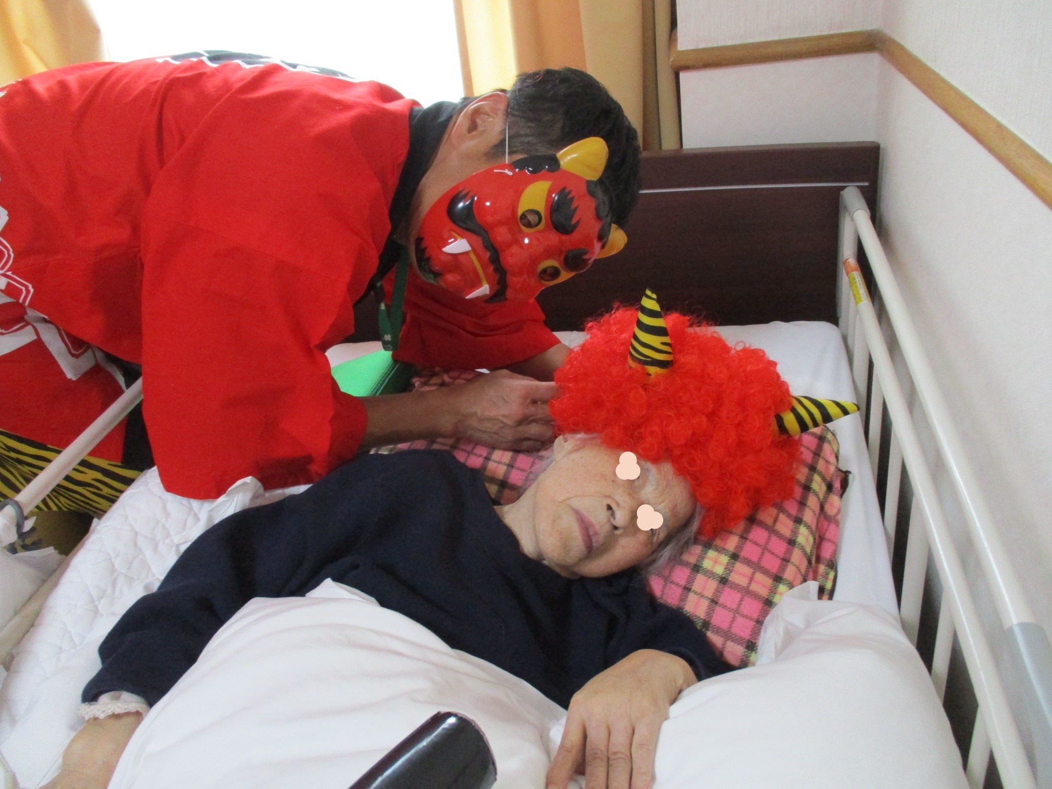 お部屋でお過ごしの入居者様の所にも鬼になった職員が訪室し、