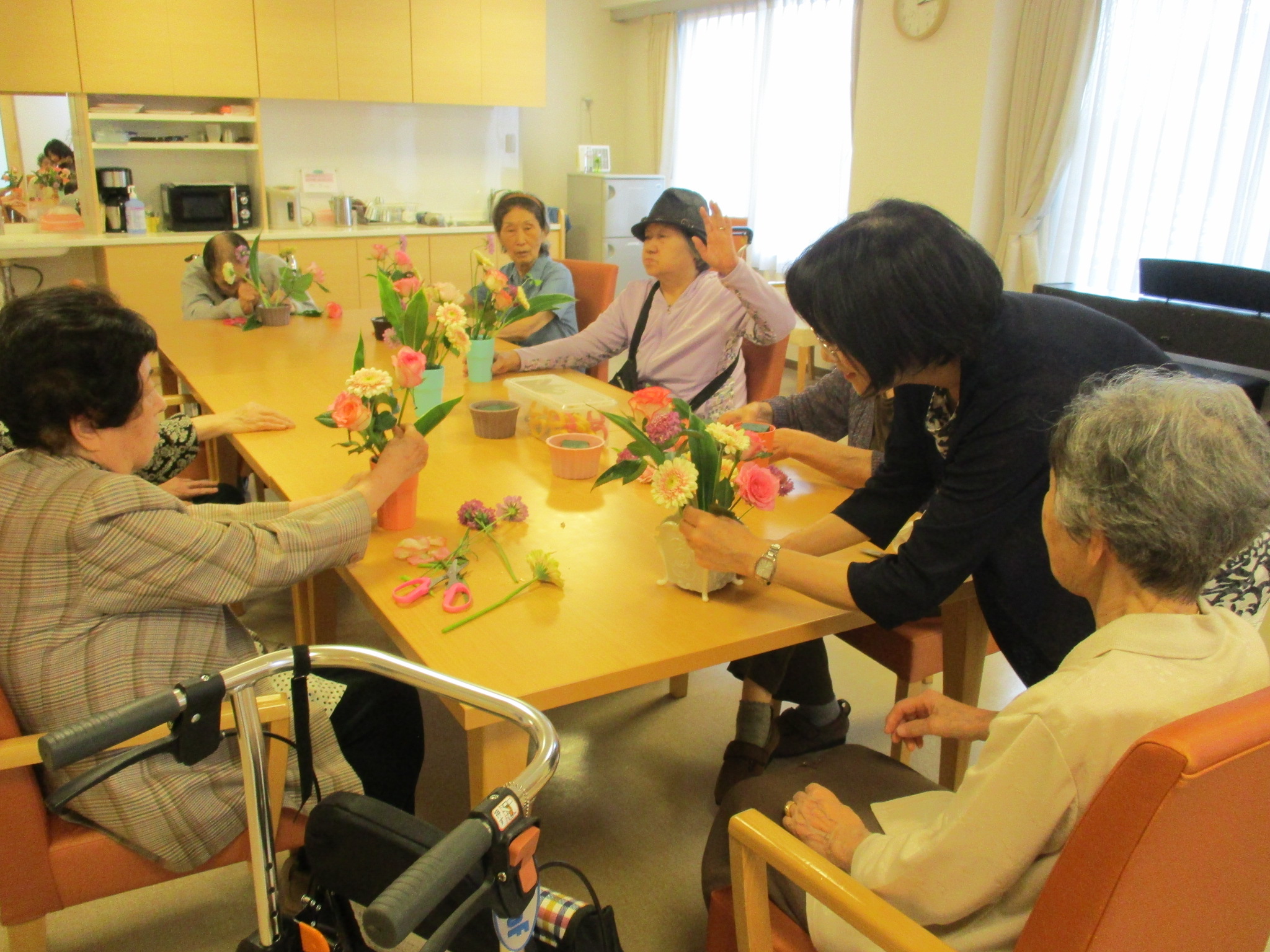 女性に人気のレクリエーションの一つフラワーアレンジメントが7月13日に行われました。お花はいつ見ても心を癒されますね。皆様思い思いのセンスで綺麗なアレンジメントが完成しました。個性ある作品に大満足です。