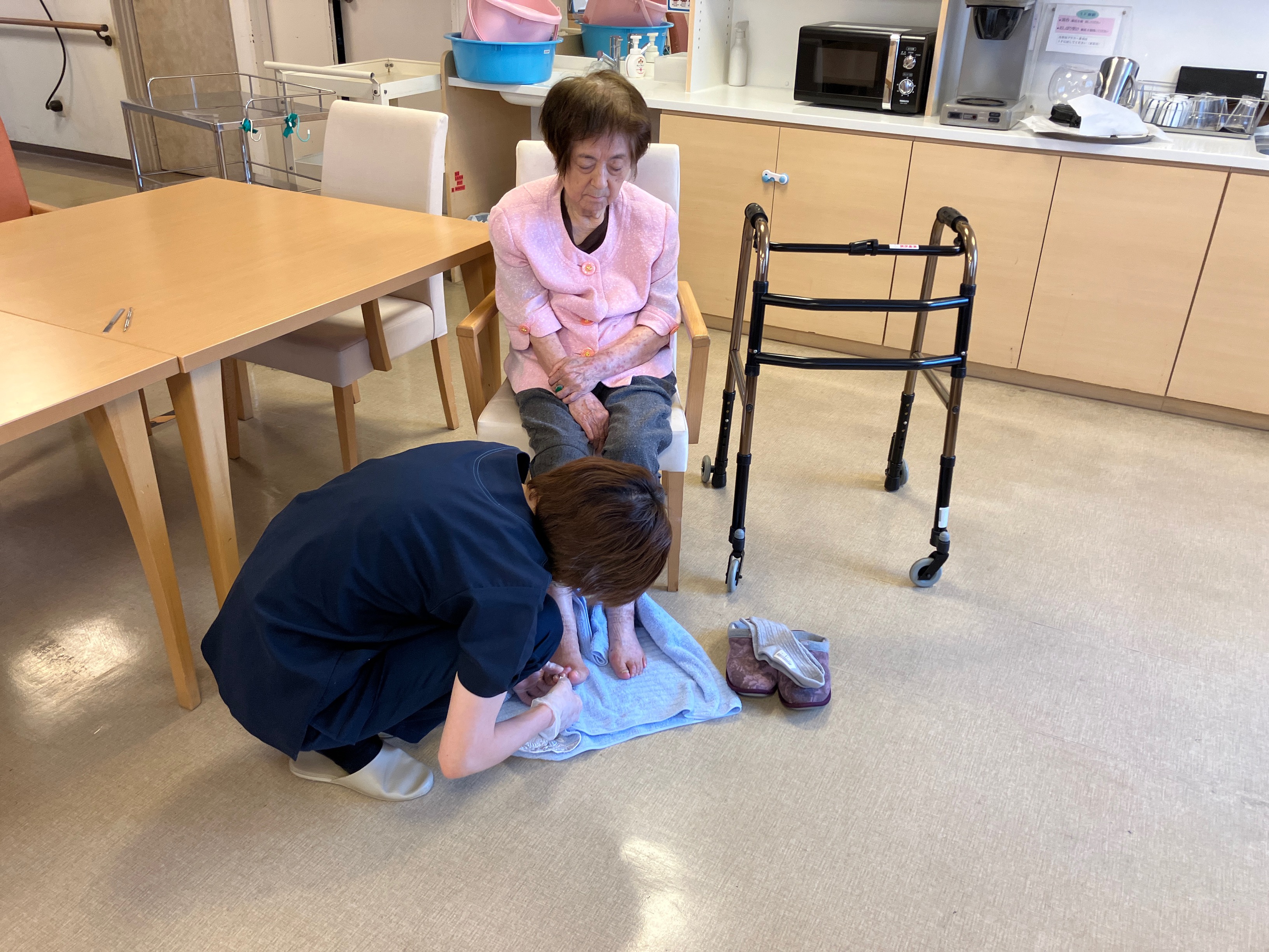 フットケアでは足をお湯に付けてふやかした後に爪切りなどのケアを行います😁
