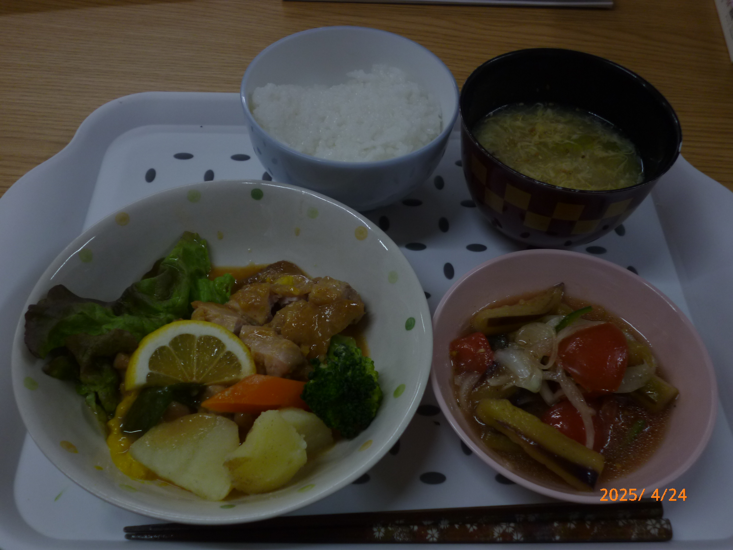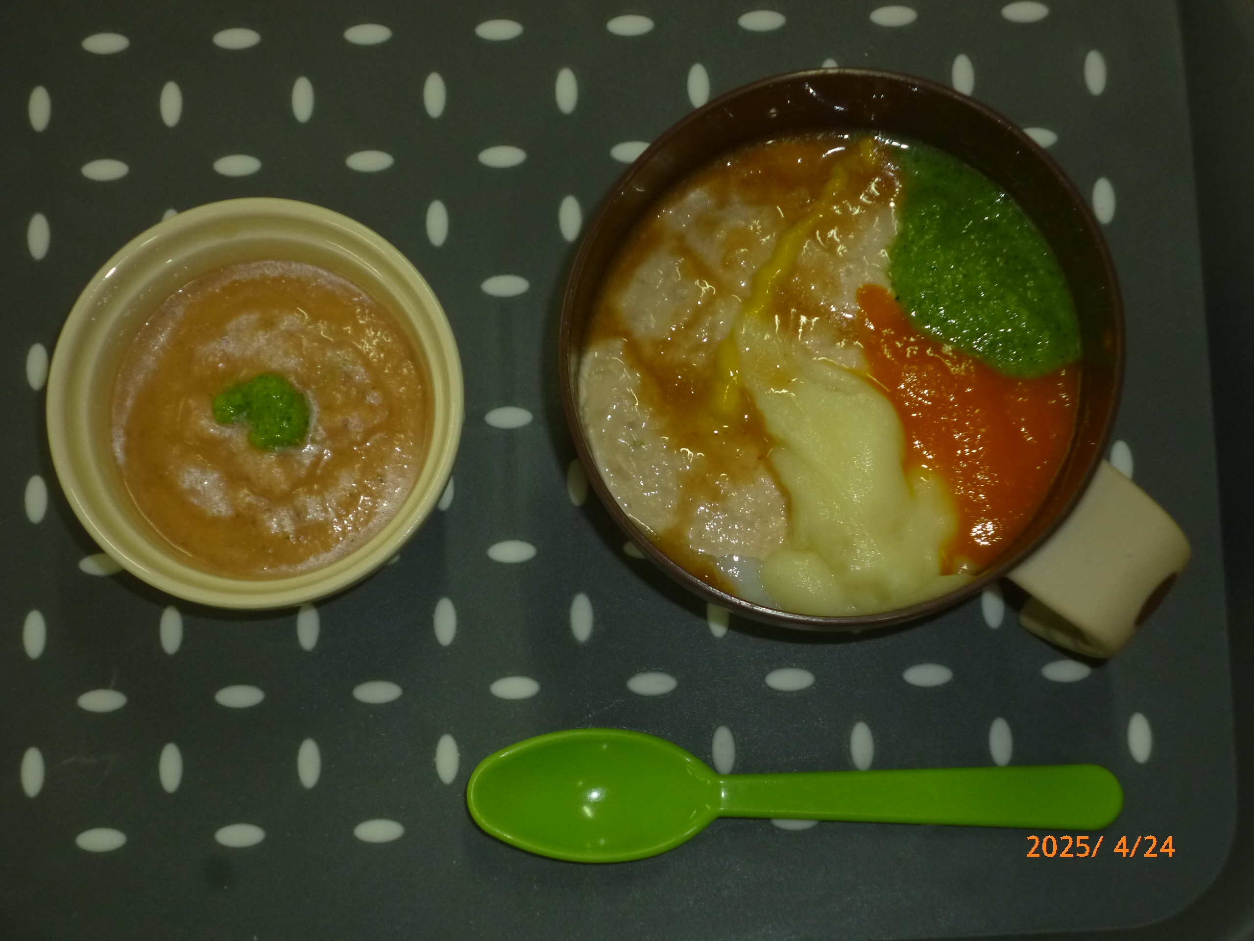 常食の方向けと嚥下をいたわる方向け(ペースト状)をご紹介いたします。食をそそるように気にかけて配膳しました。