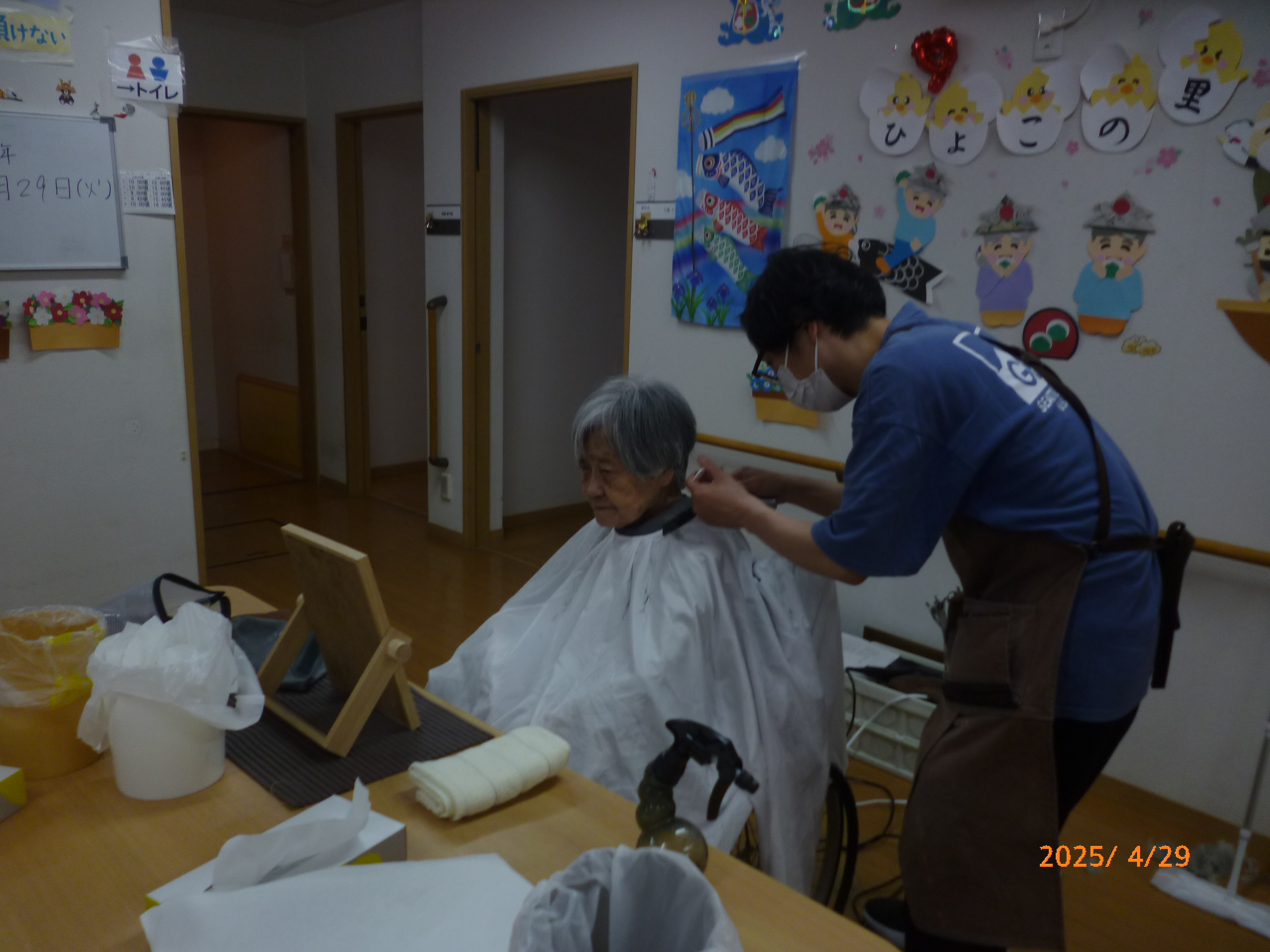 先日は ご希望のご入居者様たちに 散髪を提供いたしました。理美容師さんが来訪され 手際よく丁寧にヘアカット、すっきりしたわと 喜びのお言葉をいただきました。