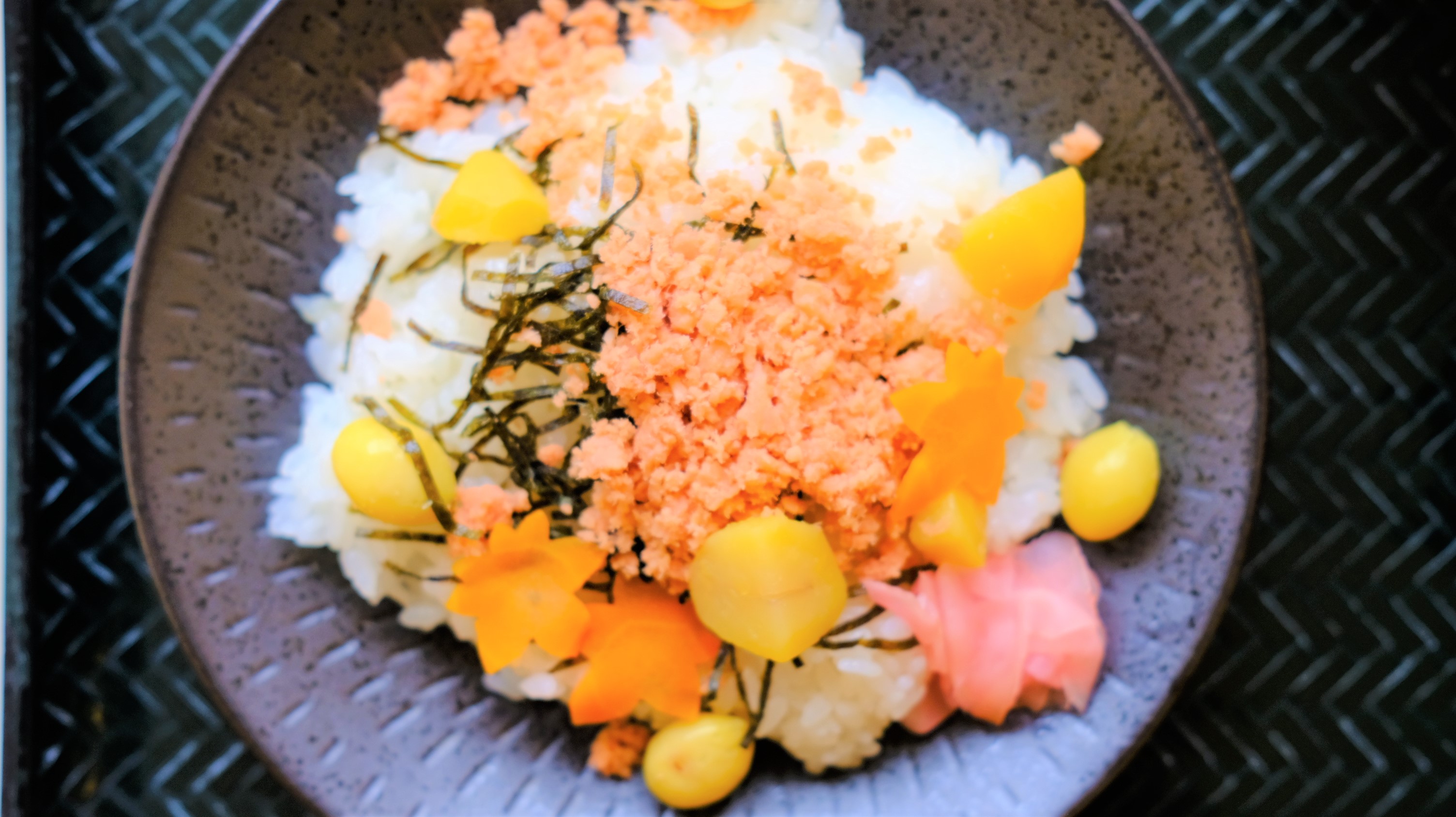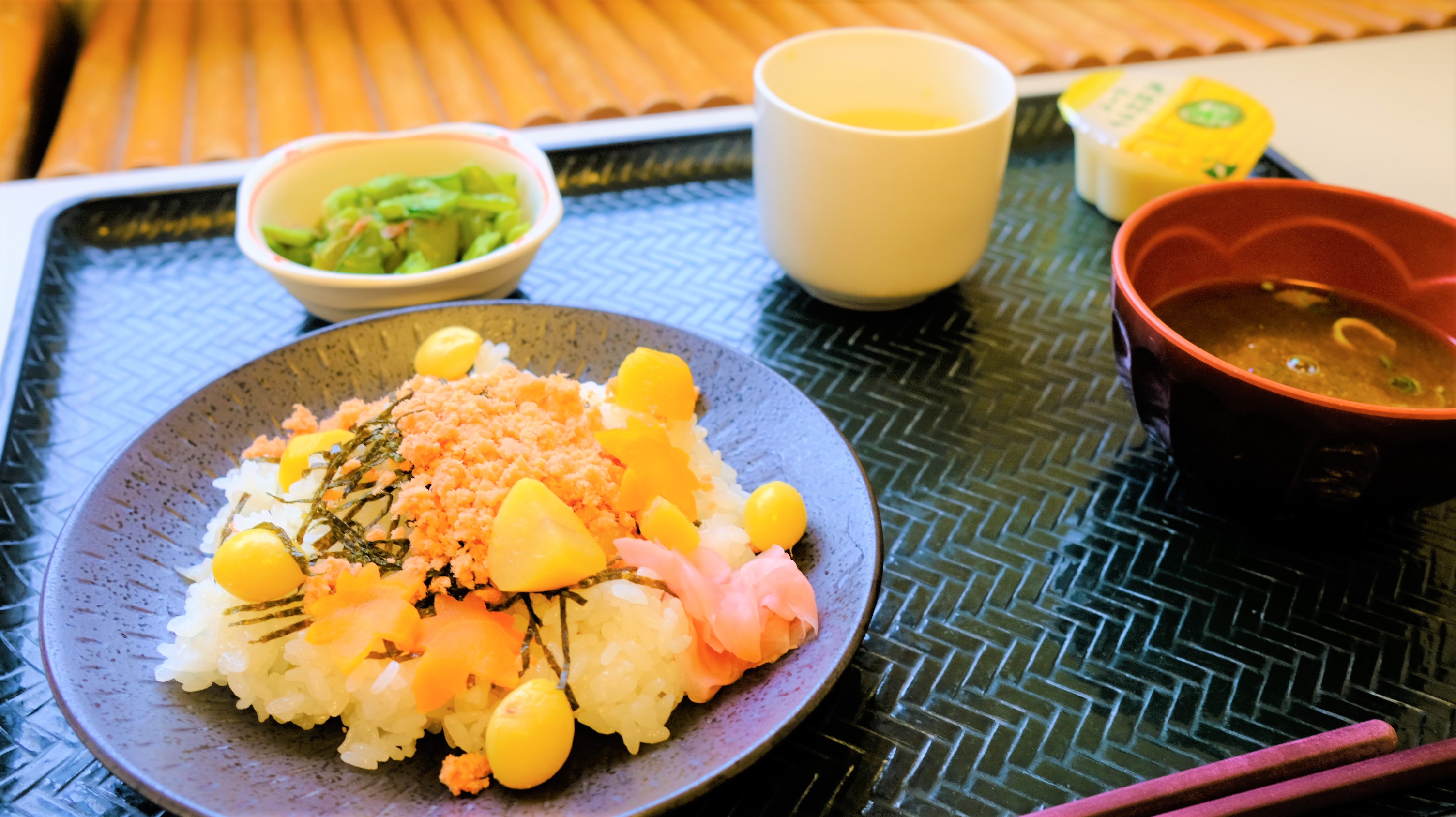 本日の昼食は『秋の味覚ちらし』です!栗に銀杏、鮭がたっぷりです!
