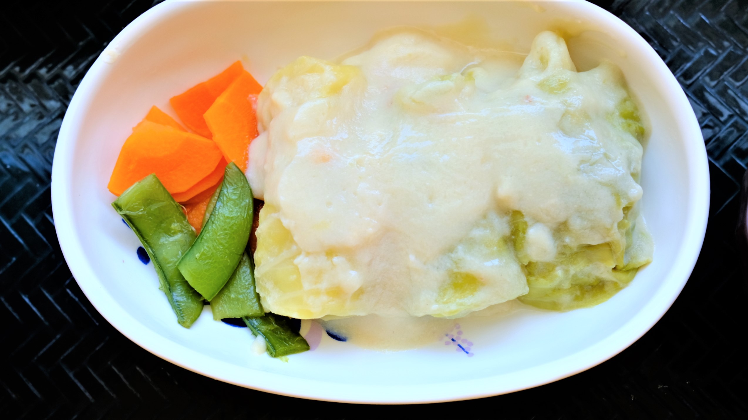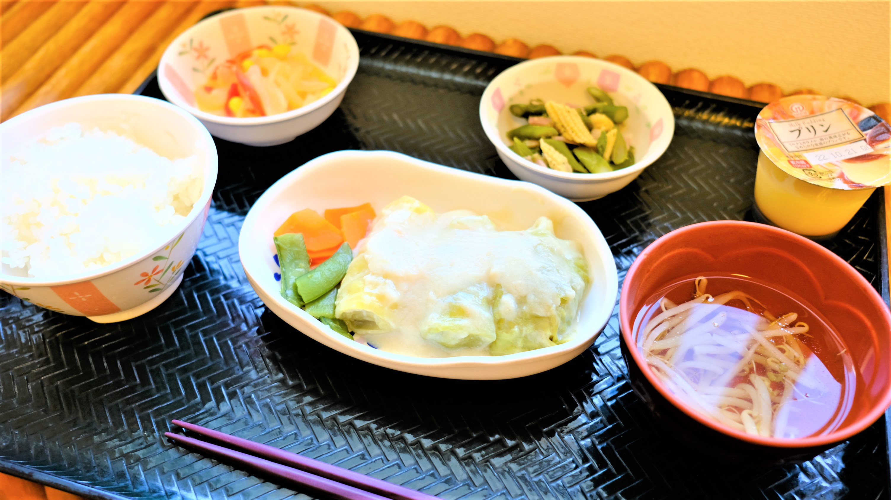 本日の昼食は選択メニュー、A ロールキャベツの豆乳クリーム煮 B さわらのチーズ照焼き です! ご紹介するのはAのメニューです。