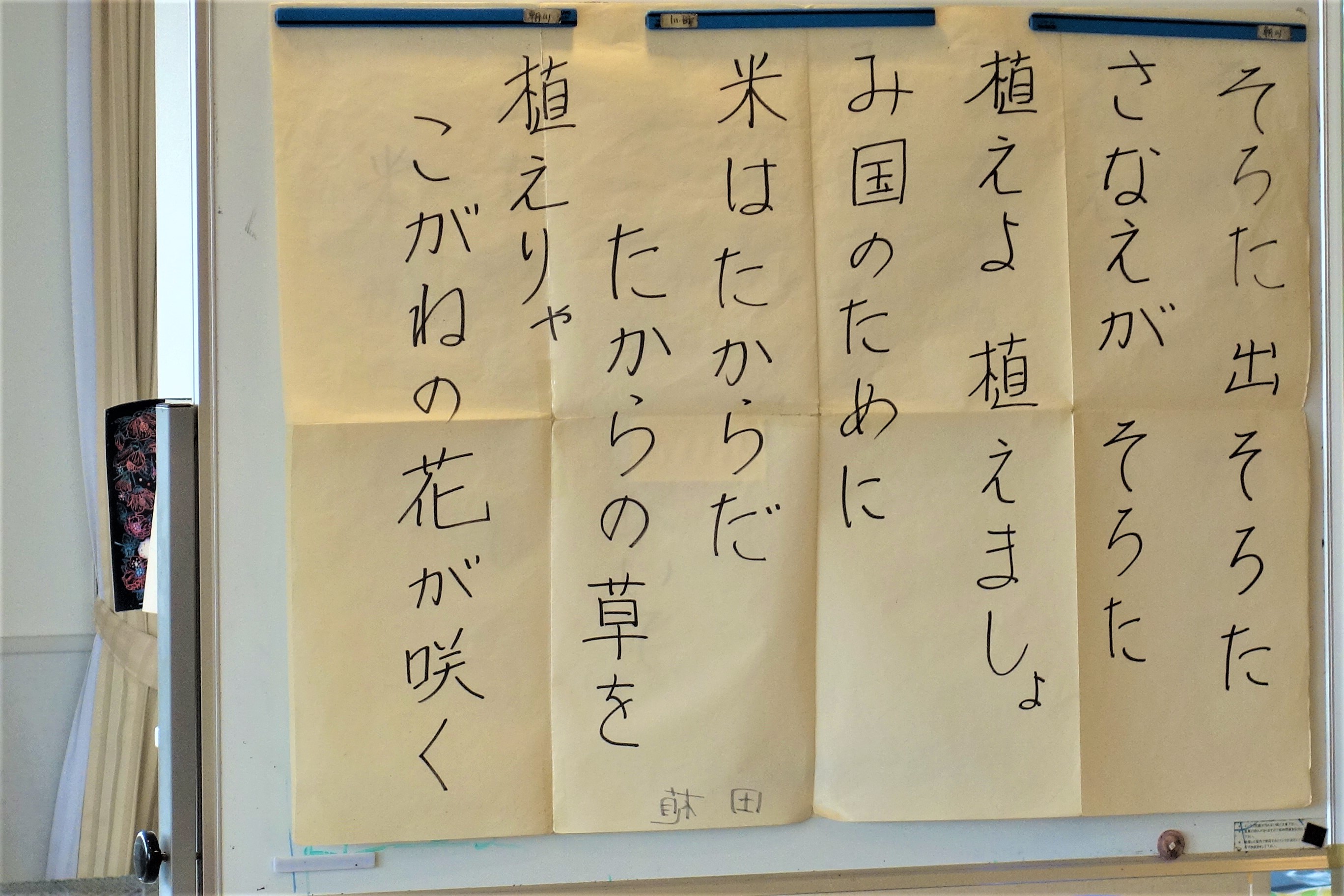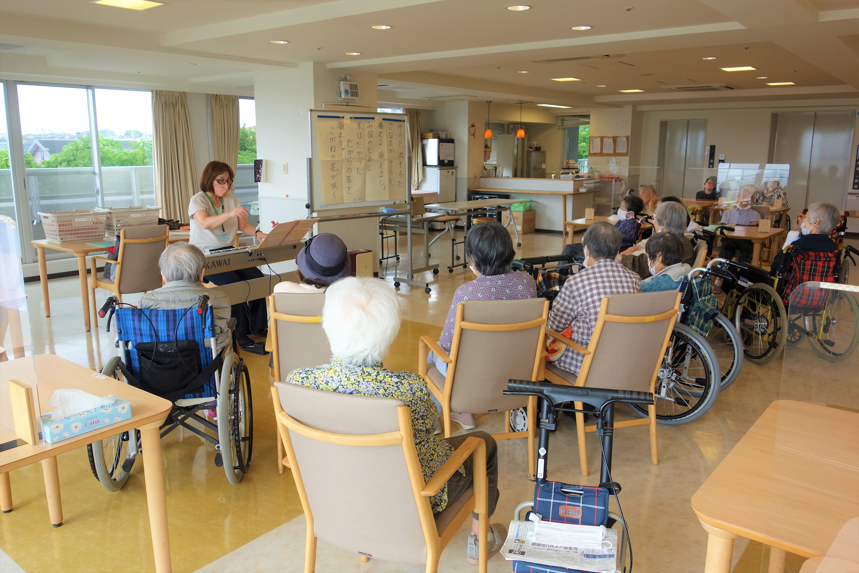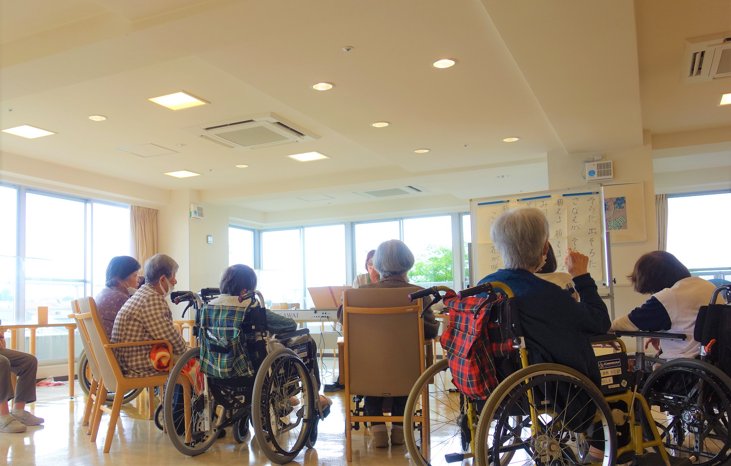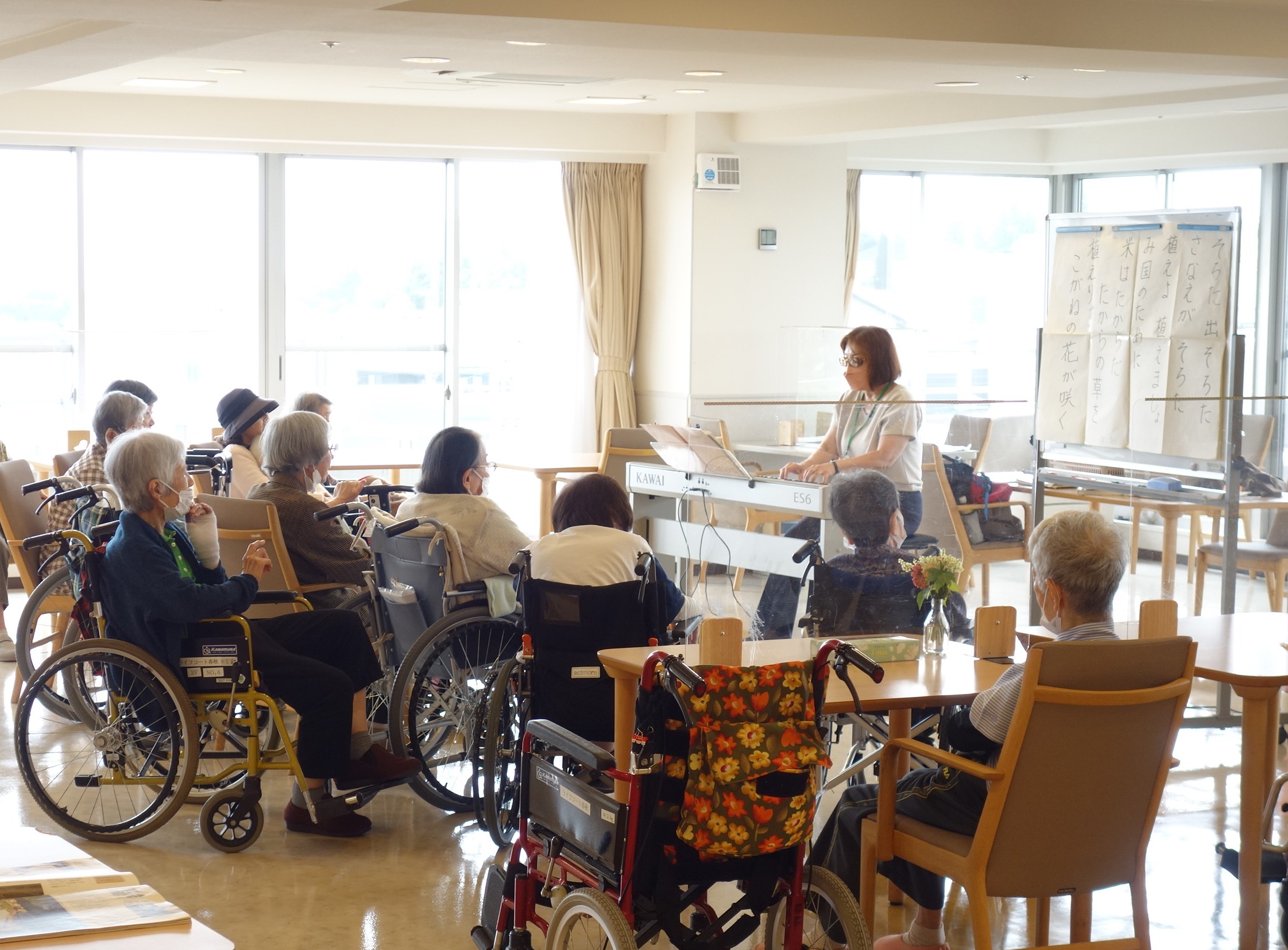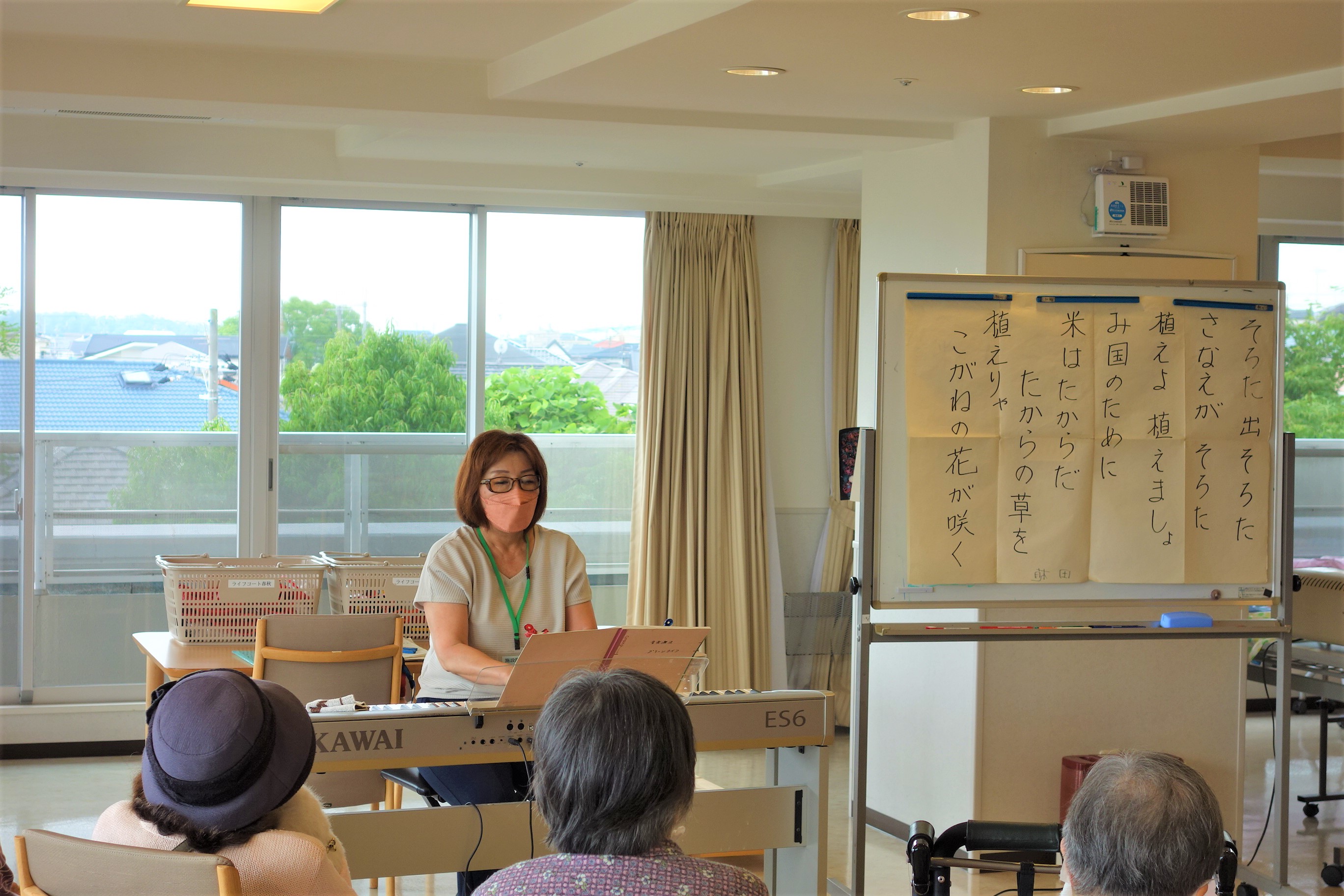 午前中、2階フロアで音楽療法を行いました。季節の歌を先生の伴奏に合わせ、楽しく歌いました。