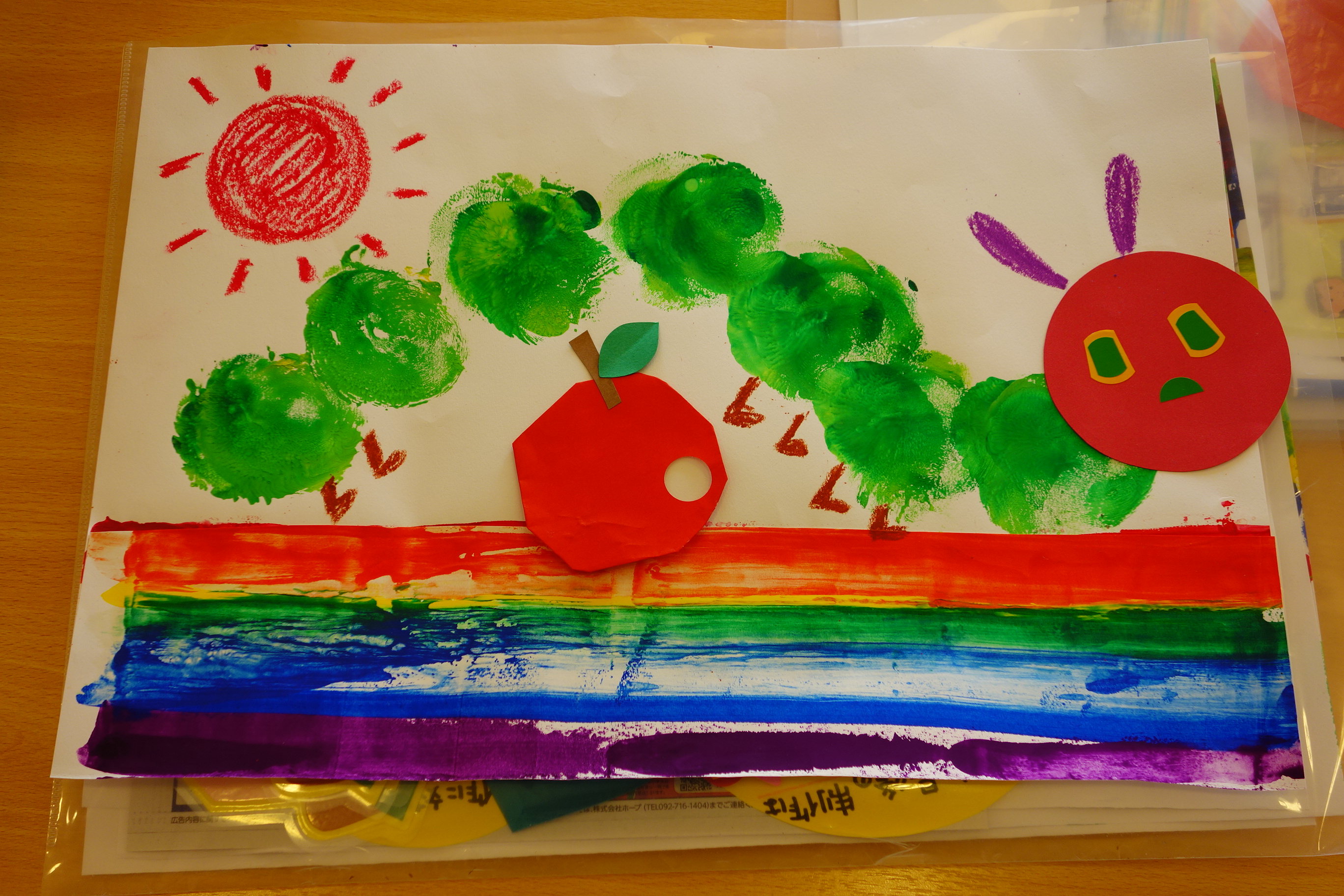 あおむしが歩く虹は、絵の具を牛乳パックの角で
