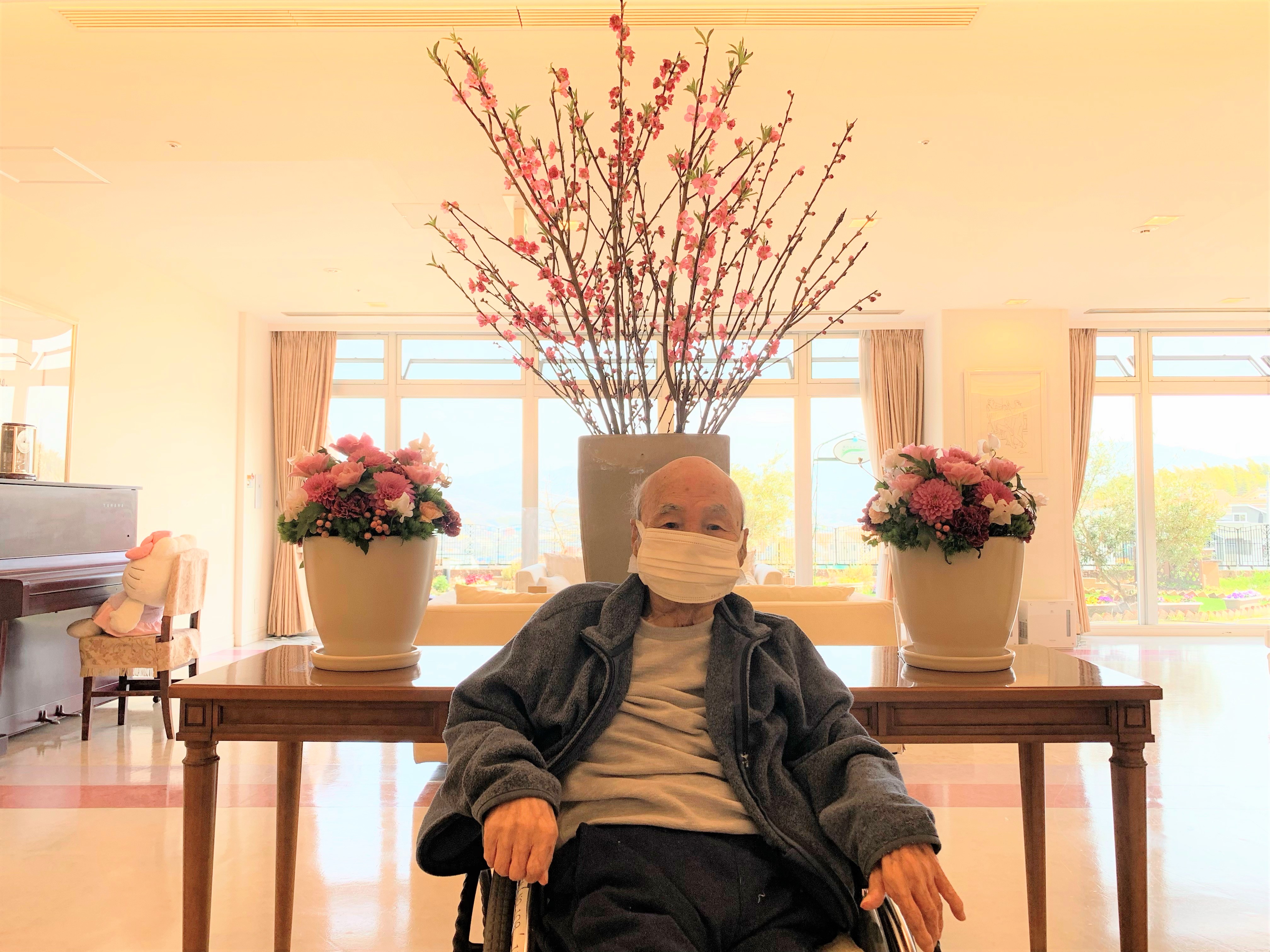 1Fロビーのお華、桃に変わって緑鮮やかなユーカリの登場です!