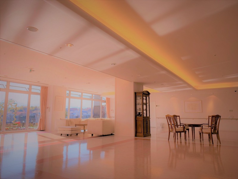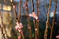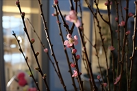 ライフコート春秋、1Fロビーの桃の花が徐々に開いてきました。