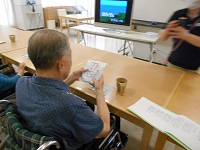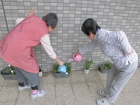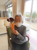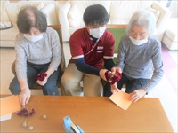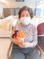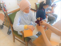 本日は、ライフコート春秋1Fロビーに毎週お花のアレジメントを届けてくださっている「ヘブン・デュオ」さんに、ドライフラワーを分けて頂いたので、ビデオ体操の後にプチ花束を作成しました。
