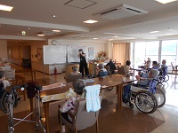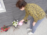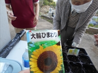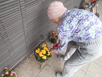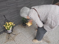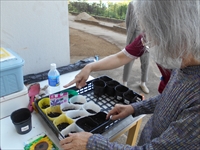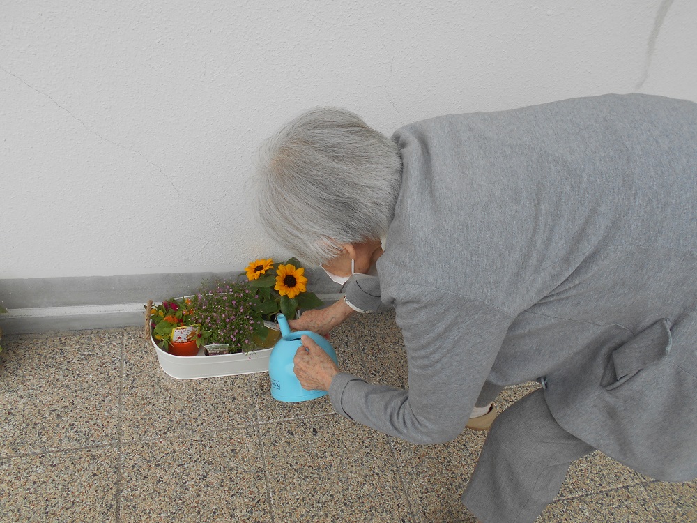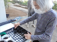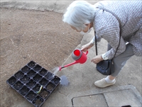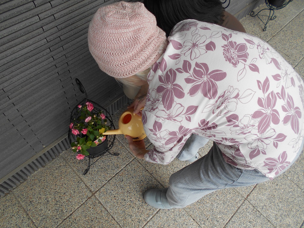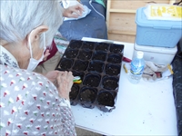 本日は入居者様と種まきを行いました。4粒ずつ小さな鉢植えにまいて土をかぶせ、じょうろで水をかけます。