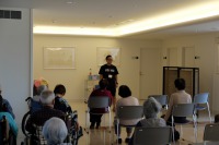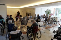 リハビリ体操の先生に来て頂いて、参加の入居者様に効果的な腕や足の運動をご指導いただいています。