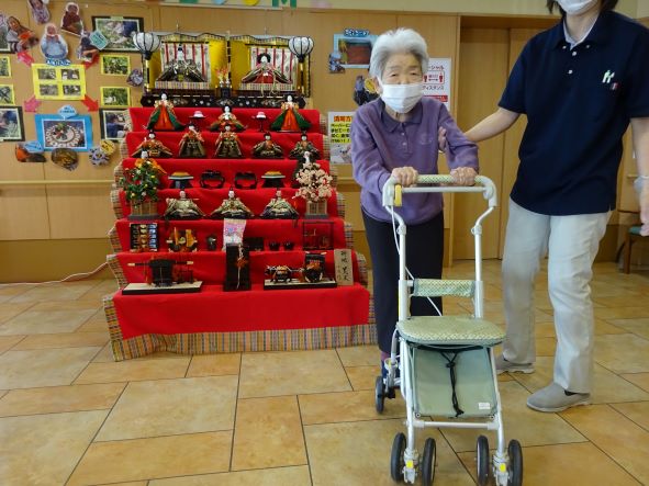 今日は気温が高く寒くないので、入居者様にお雛様を見ていただくため1階に散歩に行きました。