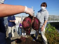 手でそ~~っと掘ると丸々としたサツマイモがドド~ンとくっついて出てきました。
