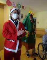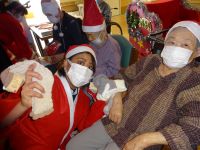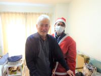 サンタさんの顔を見るなり、顔がほころぶ入居者様。