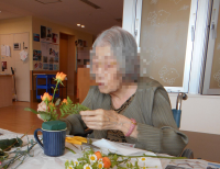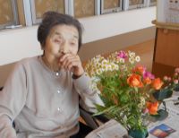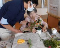 不思議に見ていたら、アレンジの先生(もちろん施設スタッフです)が「こうやって活けると長く持つのよね」と。