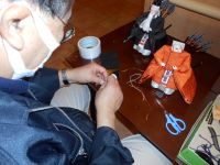 右大臣?左大臣?の帽子がなかなかはまらず、真剣に修繕しながら飾っていました。