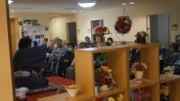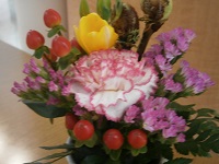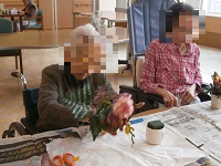 日当たりの良いラウンジにてフラワーアレンジメントを開催しました。春の色とりどりの花をお花屋さんに届けて頂きました。ご入居者様同志で、「あなたの花、綺麗ね。」「あなたも上手ね。」と会話が弾みました。皆様センスが良くとっても上手に生けて下さっていました。「花は心が安らぐわ。」と喜んで下さっていました。