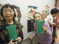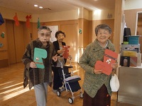 施設内の1階から4階の色々な場所にクリスマス靴下を張りご入居者様と探検しながら探しました。3名の方にはプレゼントをご用意。1階事務所にて当たりか答え合わせに来て頂きます。