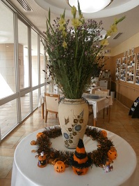 本日は晴天ですね。メディス足立の玄関も秋のコスモスからハロウィン一色に模様替えをしました。