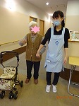 リハビリ歩行中のご入居者様。スタッフのエプロンの紐がほどけているのを発見すると・・・